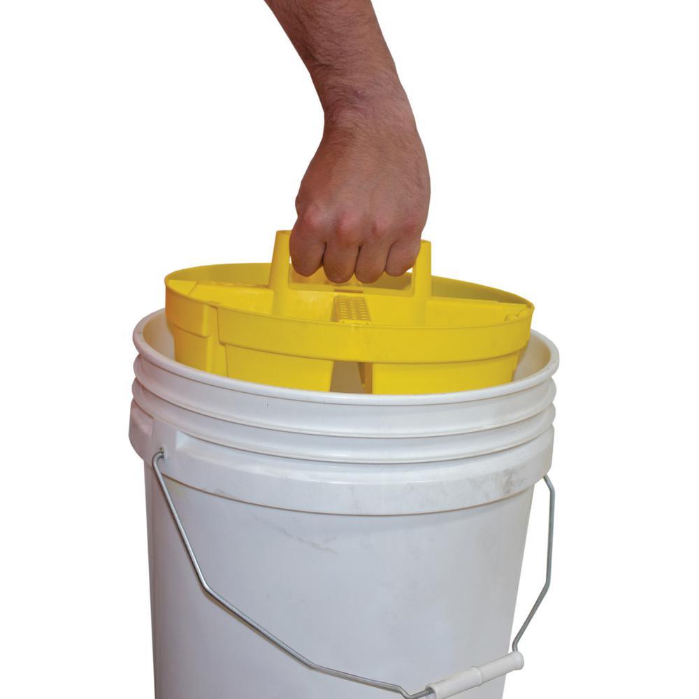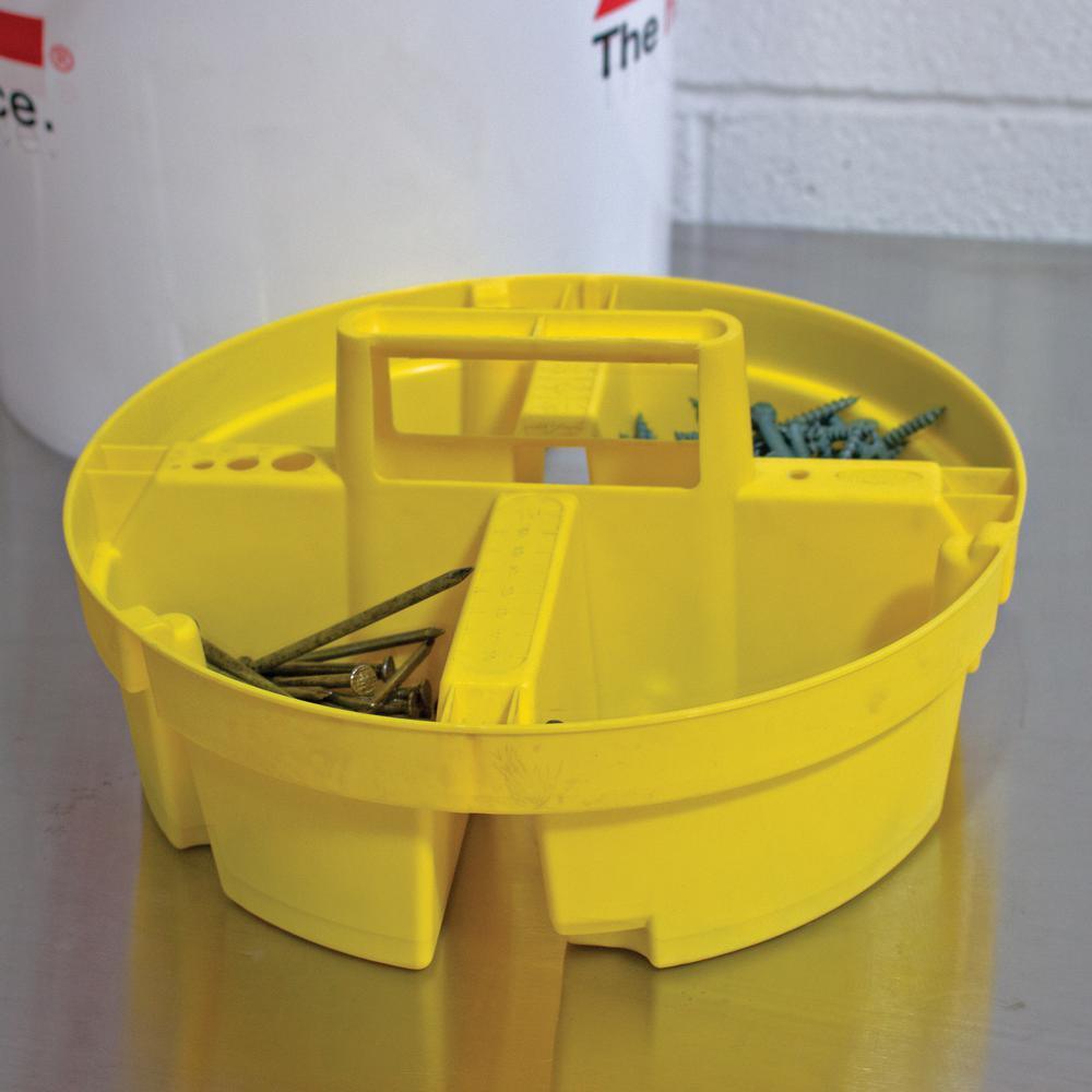 The Bucket Stacker is a molded plastic small parts organizer tray, in yellow, designed to stack inside of most 5 Gal. buckets Equipped with 4 compartments, as well as a molded center handle, you can stack up to 4 Bucket Stackers in one 5 Gal. bucket, or use them as a mobile small parts tray. The Bucket Stacker holds not only small parts and tools, but also such things as sewing accessories, craft supplies, office supplies and small gadgets.