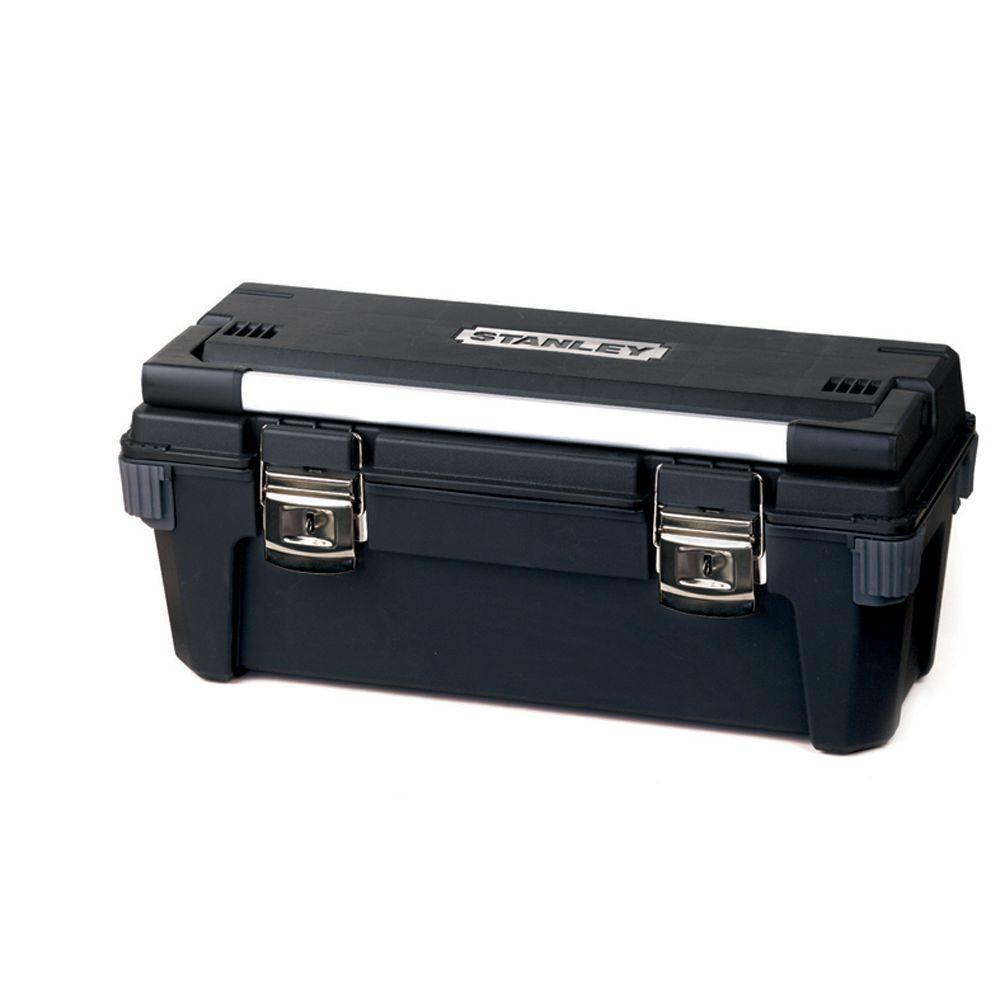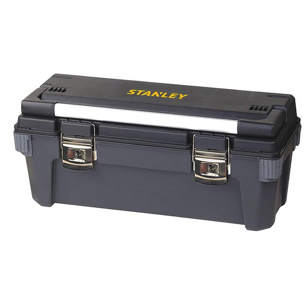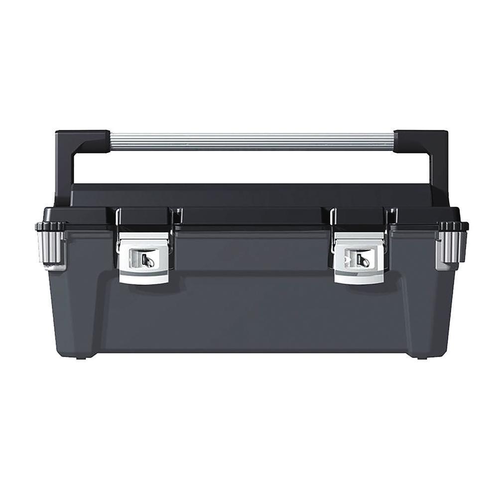 The 26 in. L professional tool box can hold up to 7.1 Gal. The 4 rubber corners protect the box from rough surfaces. The aluminum handle provides a secure grip for the user.