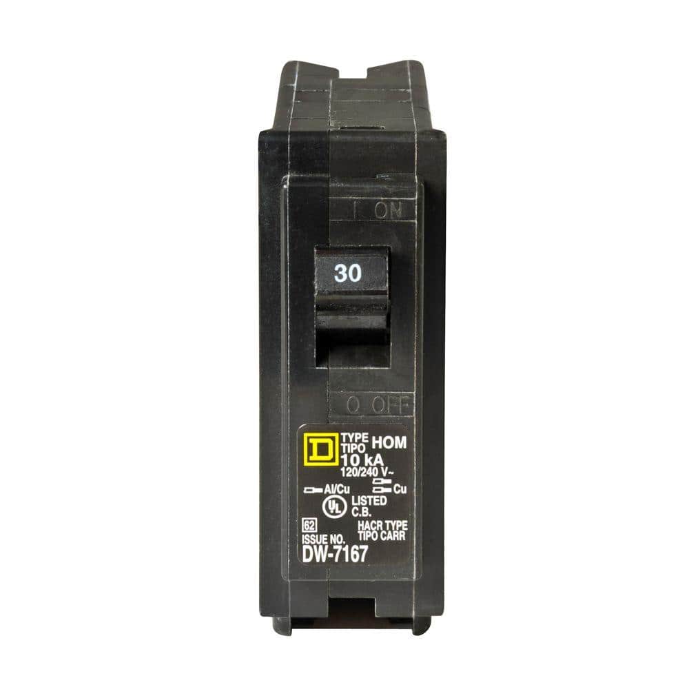 A dependable Square D Homeline 30A single-pole circuit breaker for protecting residential branch circuits from overloads and short circuits. Plug-on design fits Homeline panels and CSEDs, rated 120/240 VAC with 10,000 AIR and thermal-magnetic trip.