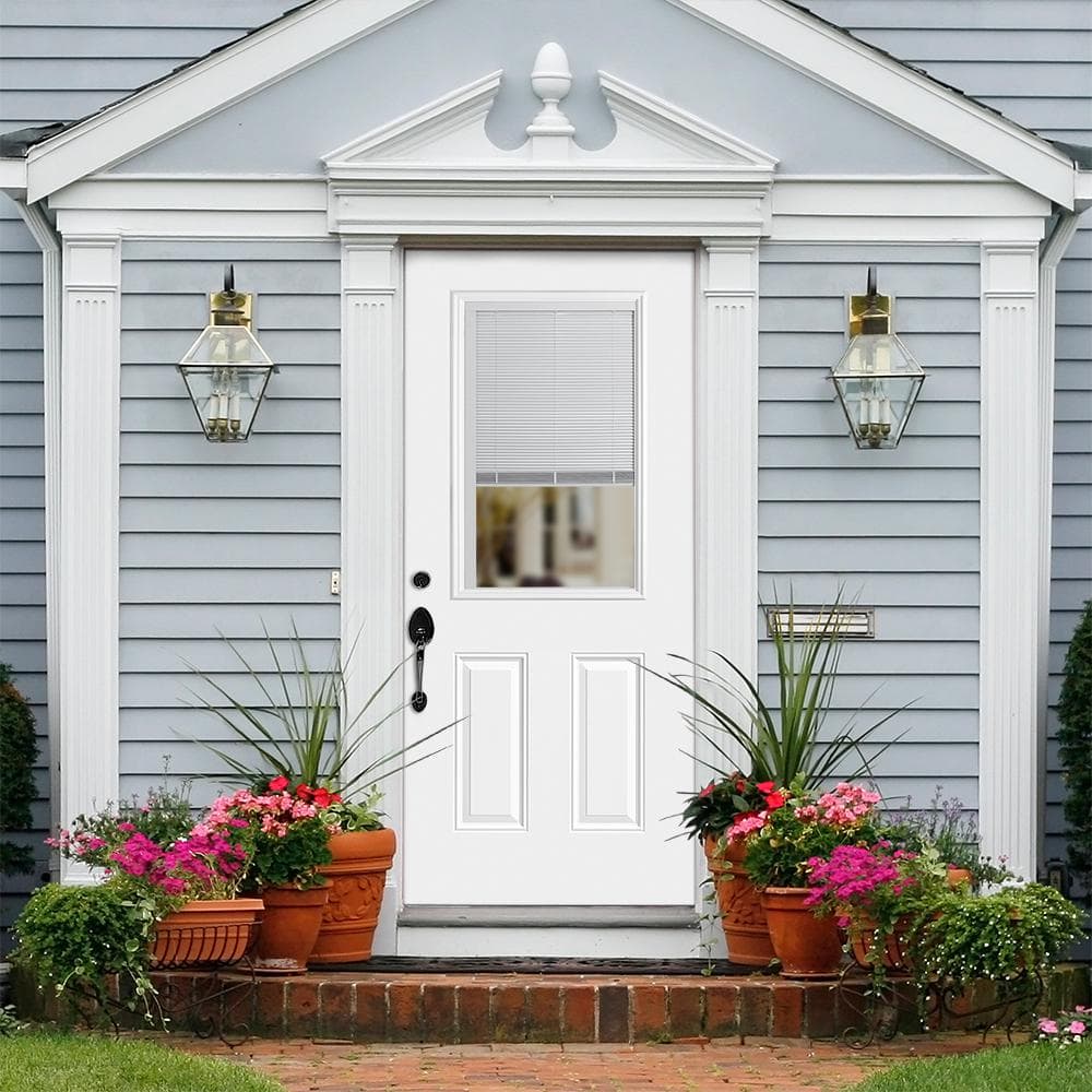 This streamlined steel door brings a tailored, architectural presence to your entry. The clear half‑lite with integrated mini blinds feels refined—letting in daylight while keeping the mood serene. Paint it a saturated hue for a chic contrast against the classic panels, then pair with matte black hardware to complete the look. It’s an elegant essential for a polished, modern welcome.