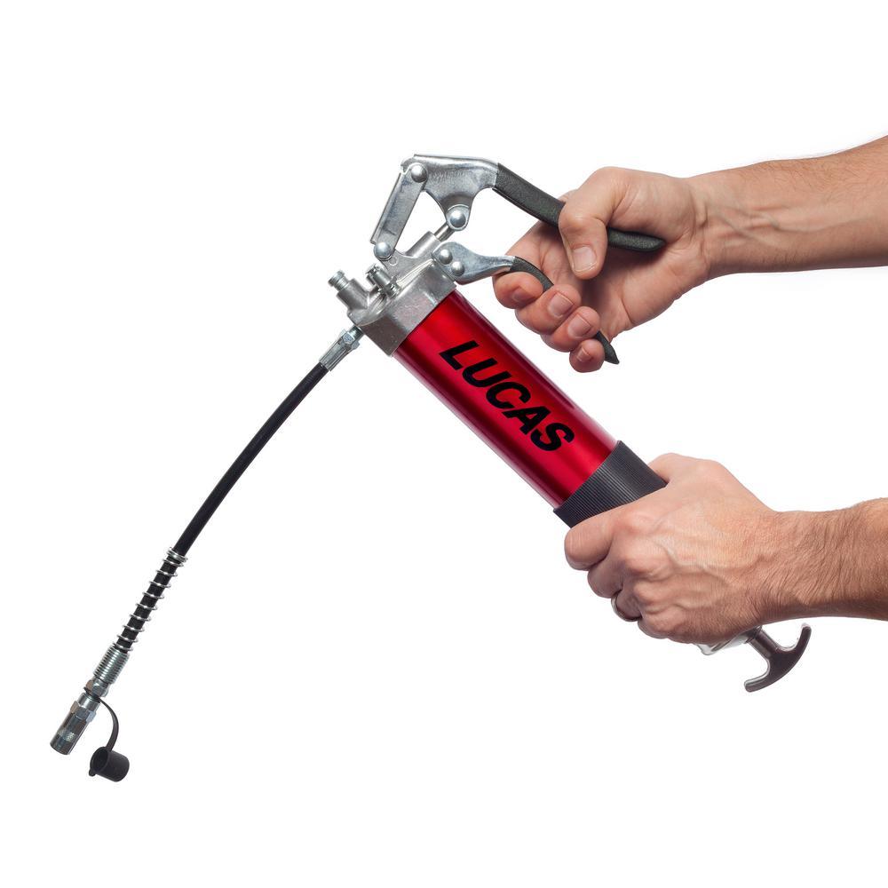 The best-selling grease gun on the market, the Lucas Heavy-Duty Pistol Grip Grease Gun is the perfect mix of performance and style. It delivers up to 10,000 psi for heavy applications and features a non-slip vinyl grip. The Lucas Pistol Grease Gun can be bulk-loaded, pump-loaded, or cartridge-loaded for added flexibility and includes an air bleeder valve for priming. As with every Lucas product, the Heavy-Duty Pistol Grip Grease Gun is built with high-quality materials and designed with best-in-class utility and ergonomics. The result is a sturdy grease gun that’s easy to load, easy to prime and easy to use. The Lucas Heavy-Duty Pistol Grip Grease Gun makes equipment maintenance fast and easy. It’s the last grease gun you’ll ever own.