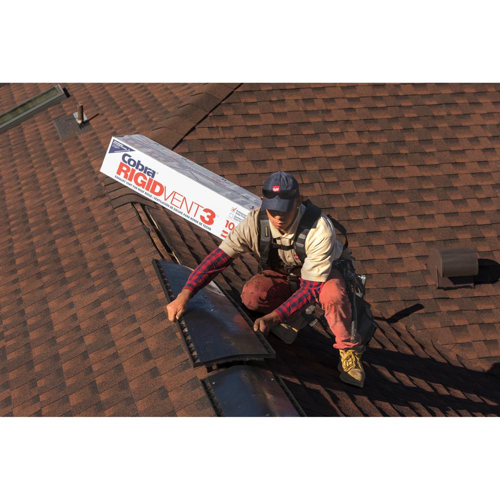 When installed as part of a properly balanced attic ventilation system, GAF Cobra® Rigid Vent 3™ is a rigid-style shingle-over exhaust vent installed at the roof ridge that helps exhaust excess heat and moisture from your attic while resisting wind-driven rain infiltration. It features a unique EasyTear® Sizing Feature that helps eliminate cutting and reduces waste. Help protect your roof system from premature deterioration by installing a properly balanced attic ventilation system consisting of Cobra® Rigid Vent 3™ at the ridge and adequate intake ventilation at or near the soffit areas of your roof.