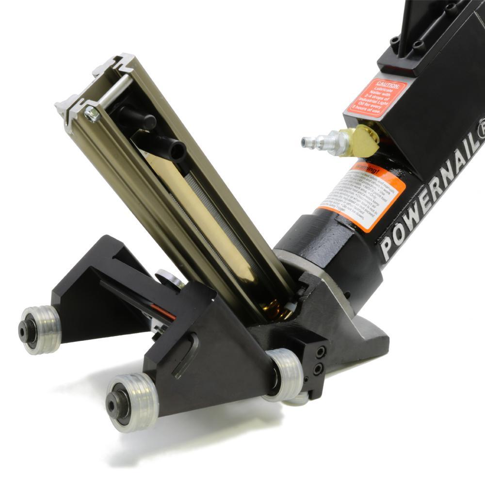 The Model 445 FLEX Power Roller is the professional's choice. This pneumatic tongue and groove floor nailer is built to exacting standards. From its cast aluminum body, anodized aircraft aluminum internal parts, specialized U-cup seals, to the best warranty in business, this is the professional's first choice. This nailer rolls across the flooring increasing speed of installation, while greatly reducing fatigue. The urethane covered precision bearings make it ideal for use on pre-finished as well as unfinished flooring. The 445 FLEX Power Roller shoots 16-Gauge, L-shaped Powercleats uniquely designed by POWERNAIL to reduce cracking and splitting. Available in sizes from 1-1/2 in., 1-3/4 in., 2 in. in length. This pneumatic is equipped with a special safety trigger, is mallet actuated and works from 70 to 110 psi. The floor thickness can be measured in inches or millimeters. The FLEX unit easily adjusts from 5/8 in. (16 mm) to 3/4 in. (19 mm) without using shims or pads. It is the perfect nailer for installing oak, maple, ash, pine and other similar wood species. The POWERNAIL package includes: 1 white rubber capped mallet, maintenance tools and owner's manual.