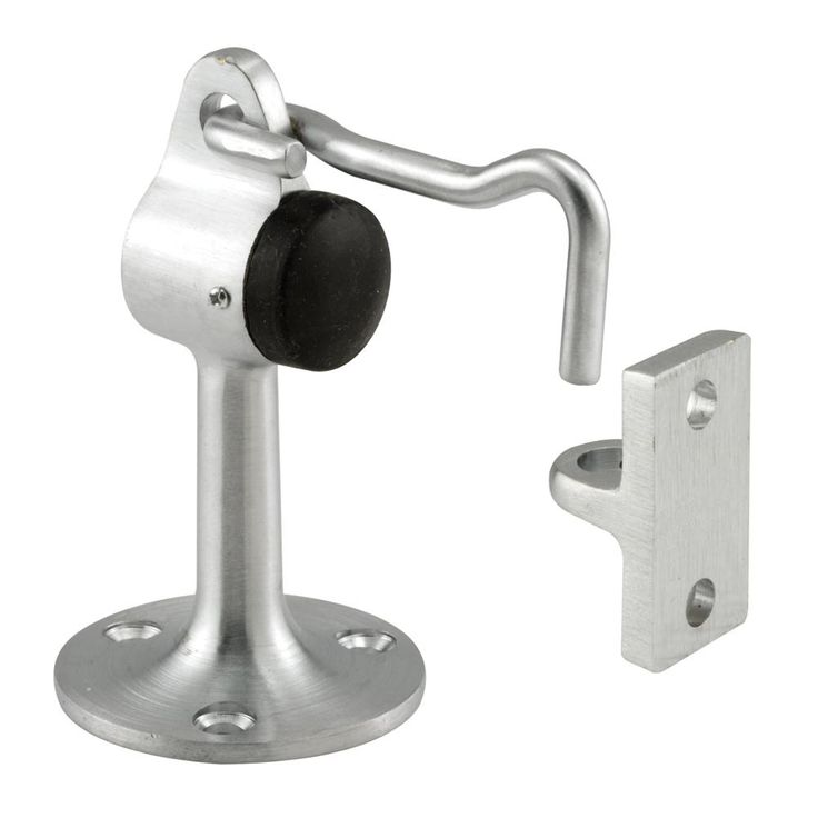 This is a hook mounted door stop made of solid brass construction and the finish is brushed chrome. It features a rubber bumper and is mounted to the floor. It has 3 mounting holes and includes lag screws for mounting.