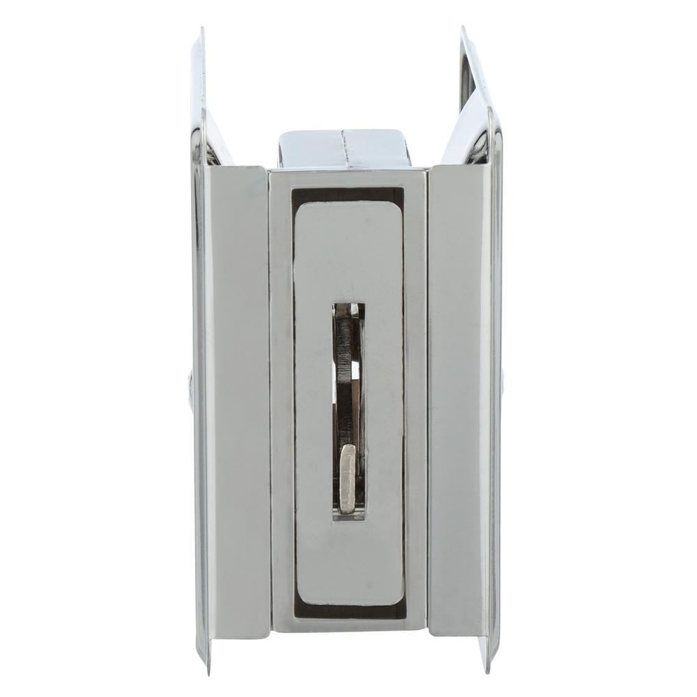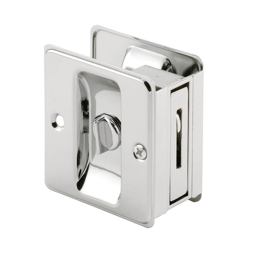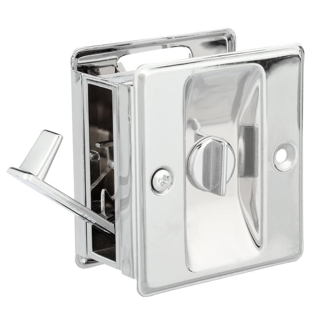 This is a privacy lock and pull for a pocket door in polished chrome. These are designed to fit pocket doors from 1 3/8 in. to 1 3/4 in. thick. They are also designed to be reversible.