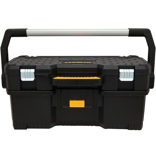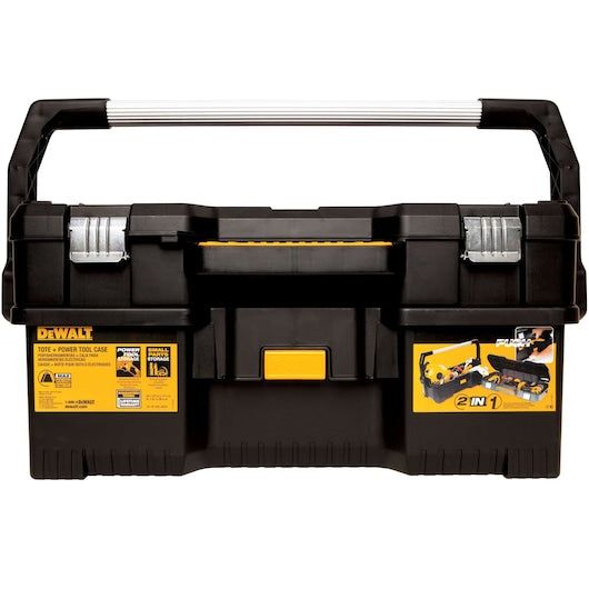 The DEWALT Black Resin Tool Tote with Removable Power Tool Case features a large storage compartment that's ideal for carrying power tools, hand tools and medium-to-large items. The tote's full-size metal handle offers convenient transport and its locking metal latches enhance the safety of stored items. A V-groove with a ruler on the top of the lid holds materials like lumber and pipe in place for easy cutting.