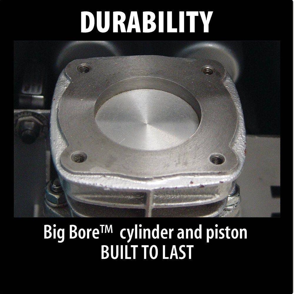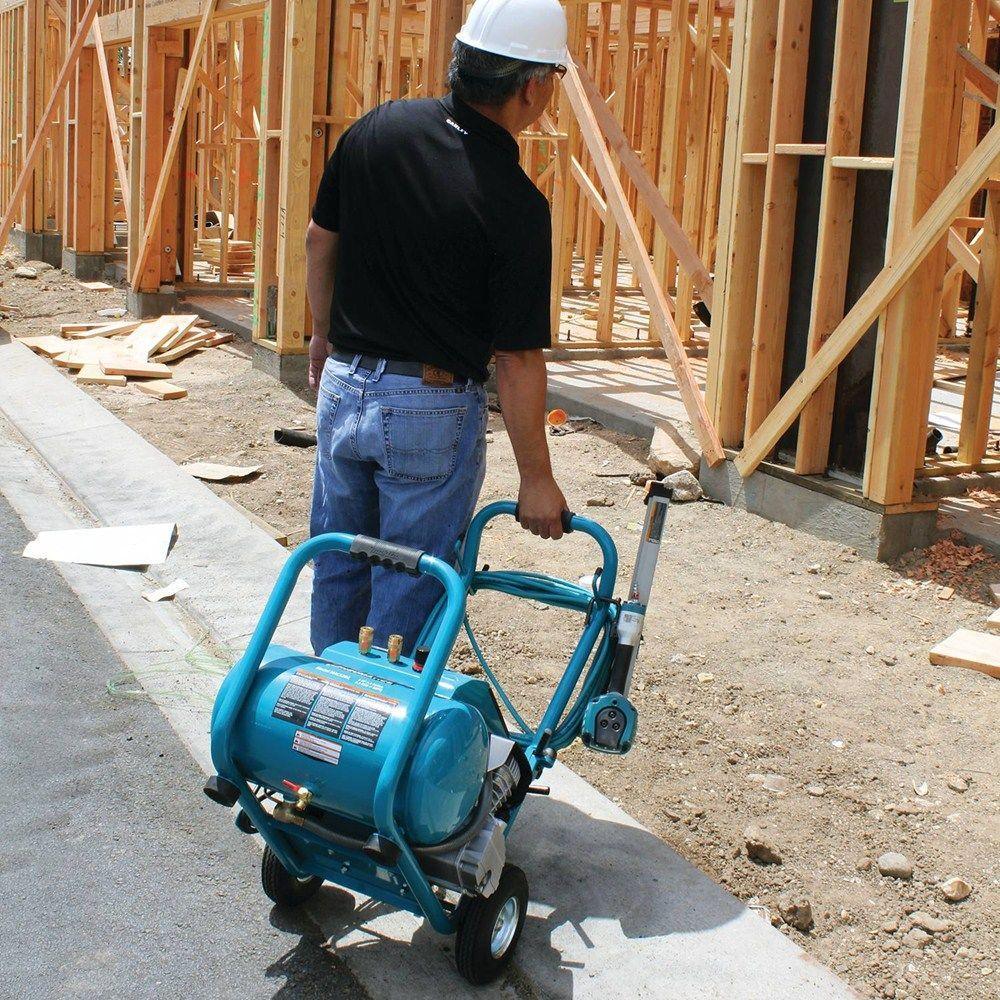 Makita's 3.0 HP Air Compressor is equipped with Makita's Big Bore engineered pump cylinder and piston for higher output for two nailers, with less noise and improved job site performance. The MAC5200 delivers industrial power and results with improved durability, and it also includes rugged wheels and a folding handle for easy transport. The MAC5200 is powered by a 3.0 HP motor with built-in thermal overload for additional protection. The engineered pump with cast iron cylinder has greater bore and stroke for increased compression, faster recovery and less noise.