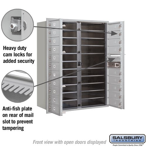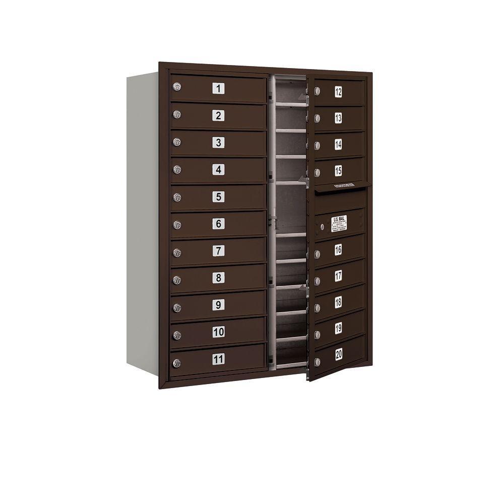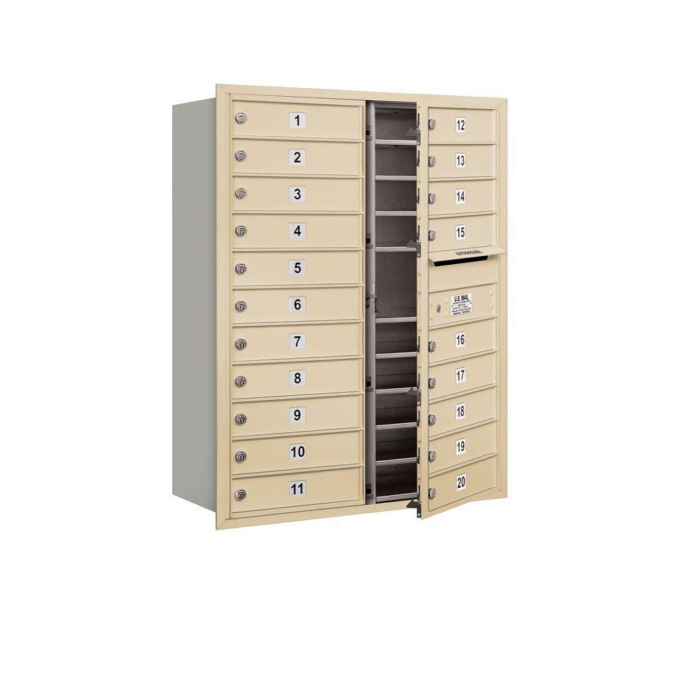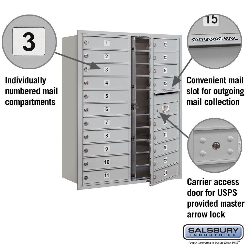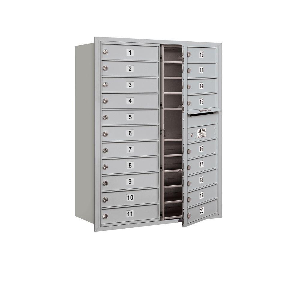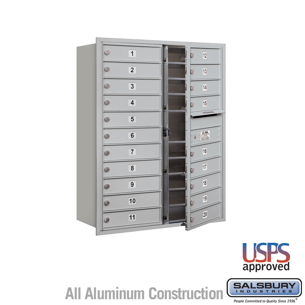 USPS-approved recessed-mounted 4C horizontal mailbox built from heavy-duty aluminum with stainless hardware. Front-loading design includes 20 MB1 tenant doors and an outgoing mail compartment, ideal for apartments and commercial buildings.