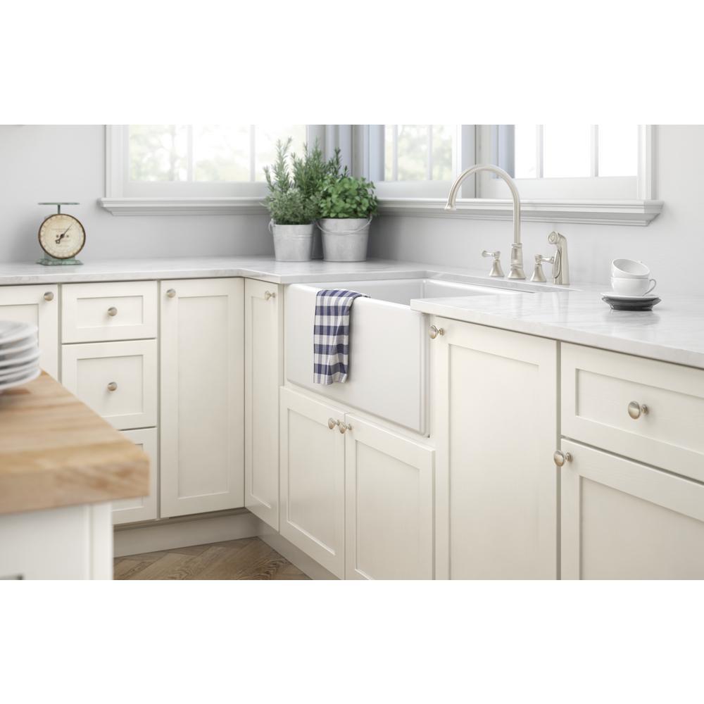 Classic satin nickel finish complements a neutral color palette and coordinates with stainless faucets and appliances