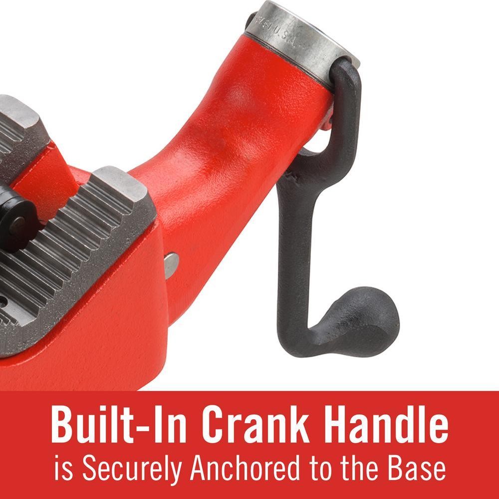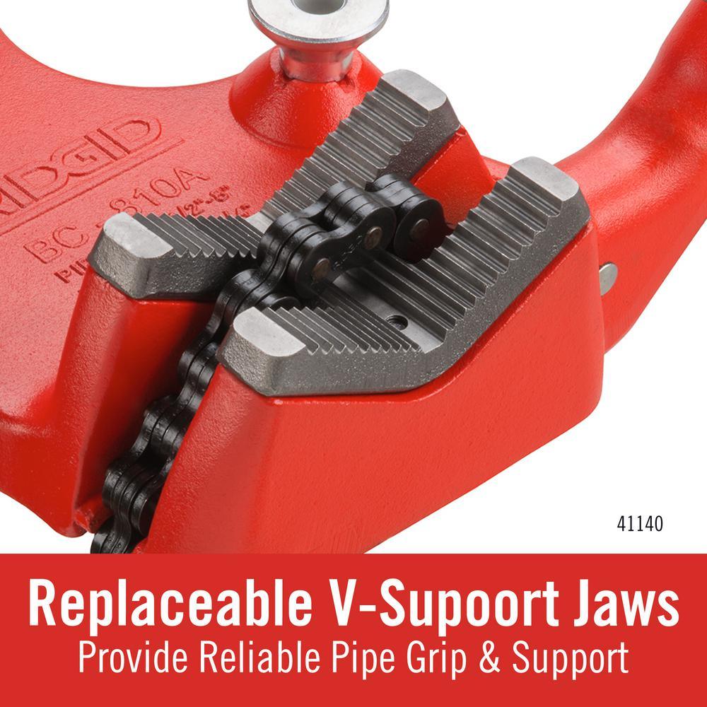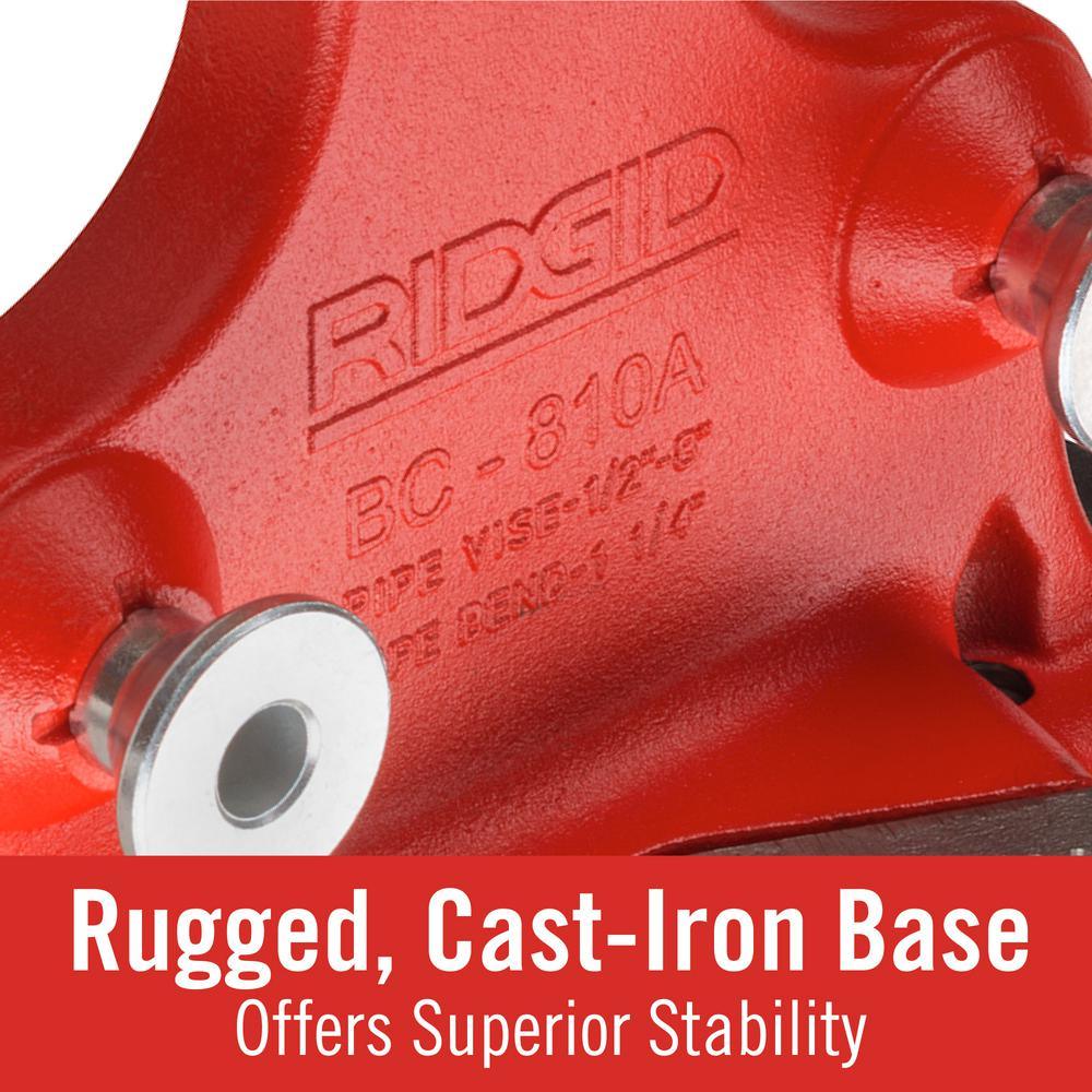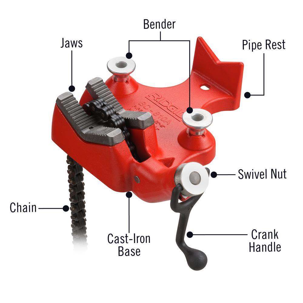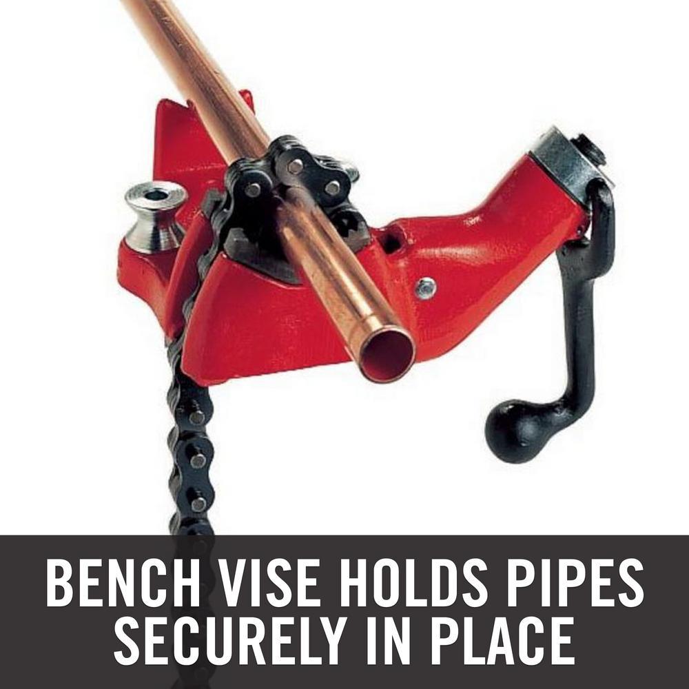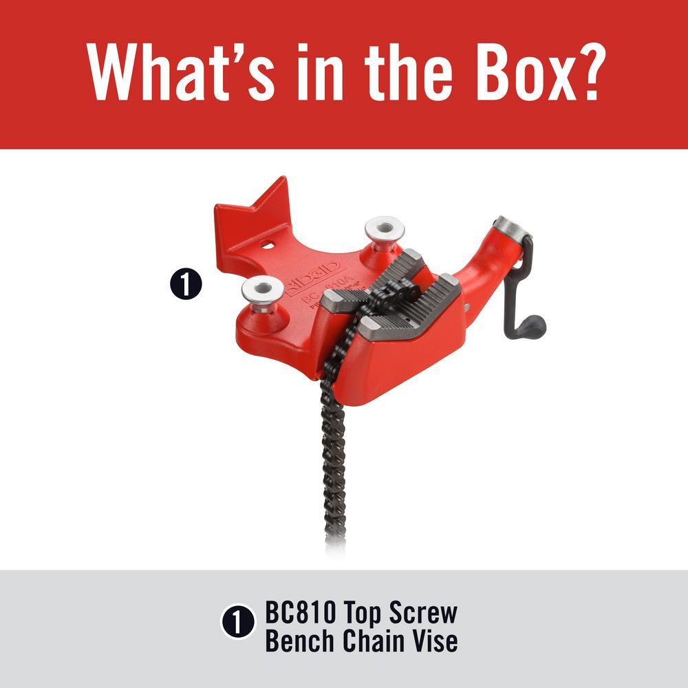 Hold pipe and tubing in place with the RIDGID BC810A Top Screw Bench Chain Vise. The bench vise securely grips metal piping and conduit with durable steel jaws. It has a built-in crank handle conveniently anchored to the base for tightening the chain. A handy pipe rest and bender help steady the pipe while providing leverage. Built to last, the chain pipe vise features a rugged cast-iron base for exceptional durability and stability. The pipe vise has a 1/2 in. to 8 in. pipe capacity and weighs 37-1/4 lbs.