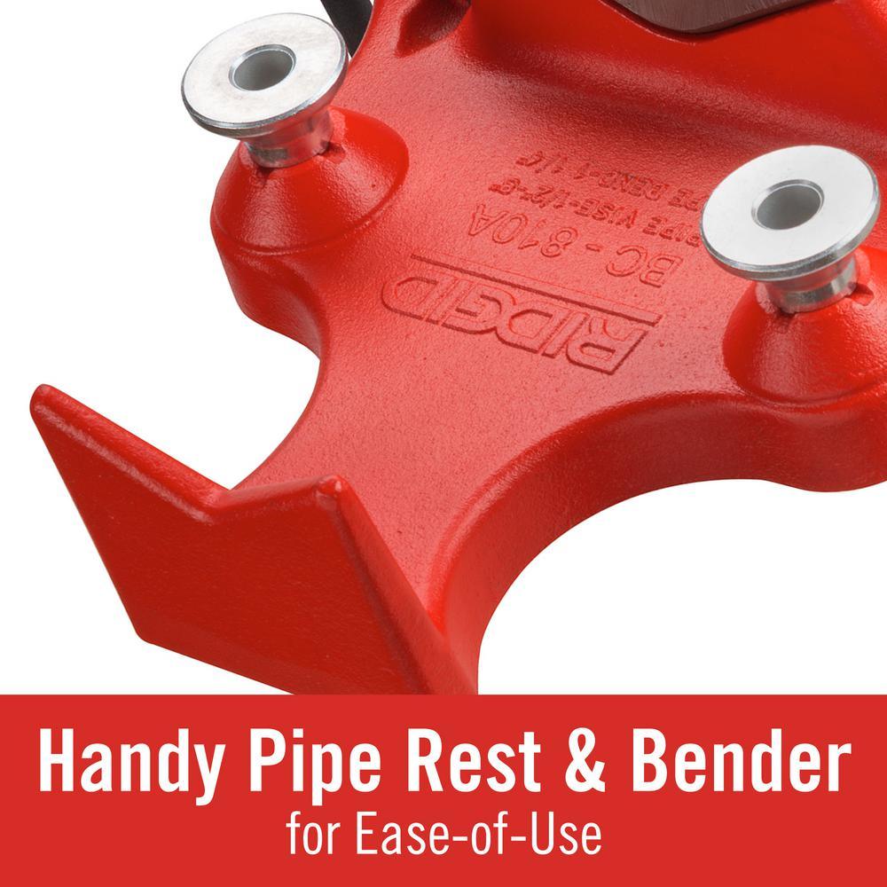 Rugged, cast-iron base offers superior stability and features a handy pipe rest and bender