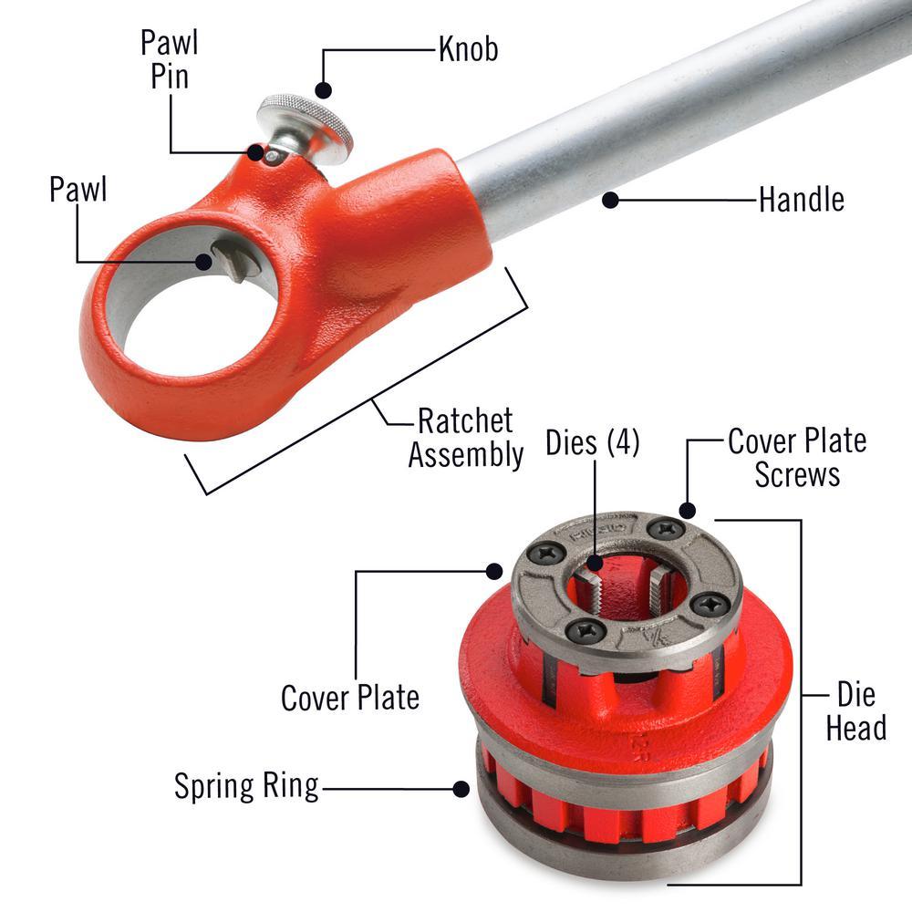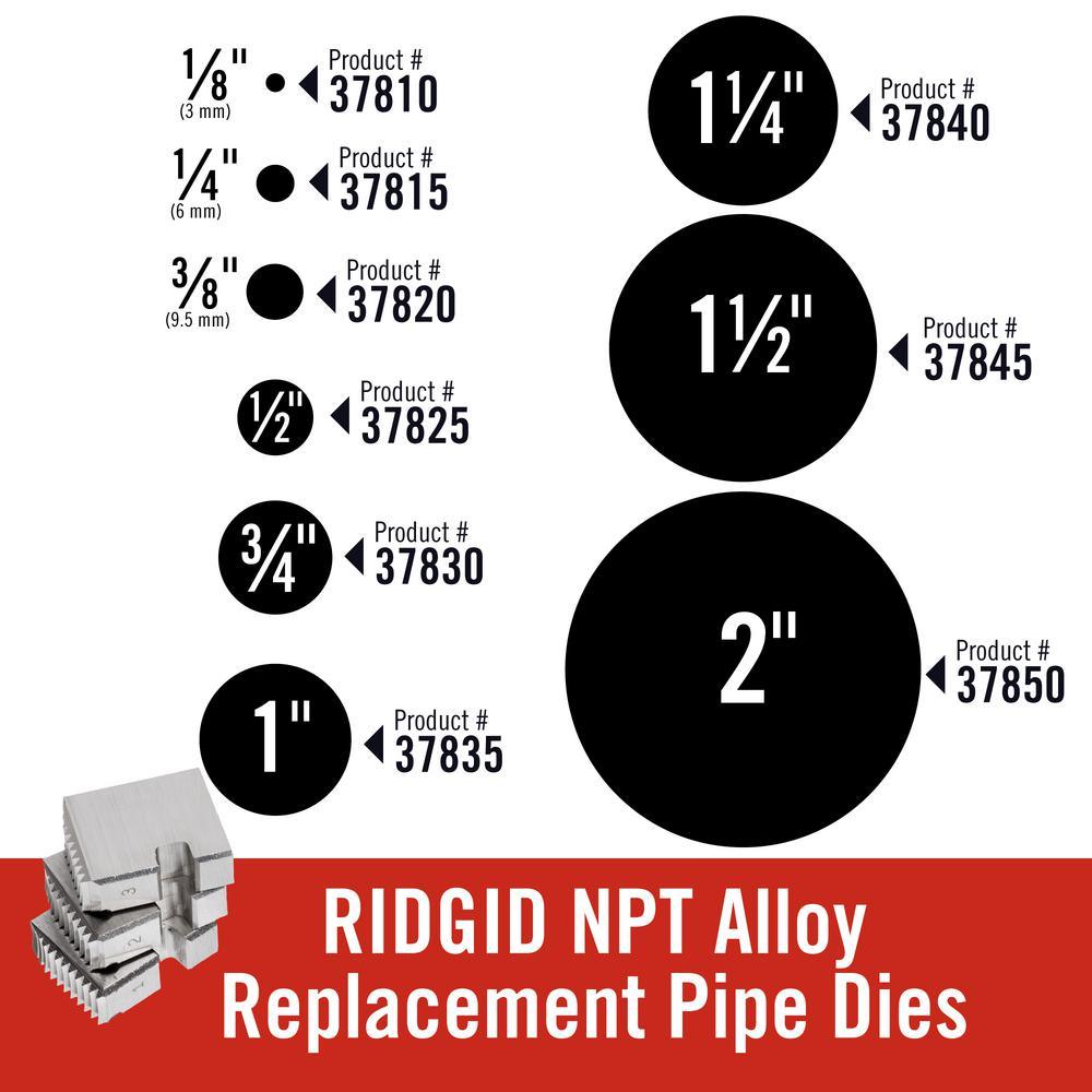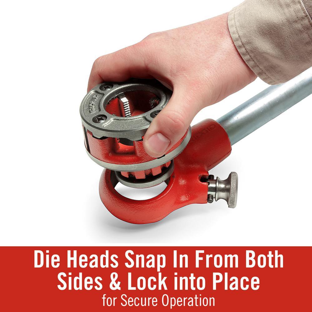 NPT die heads 1/8 in., 1/4 in., 3/8 in., 1/2 in., 3/4 in., 1 in., 1-1/4 in., 1-1/2 in. and 2 in.