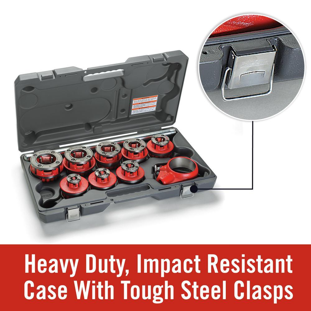 Comes with plastic carrying case to keep pipe threading tool set organized