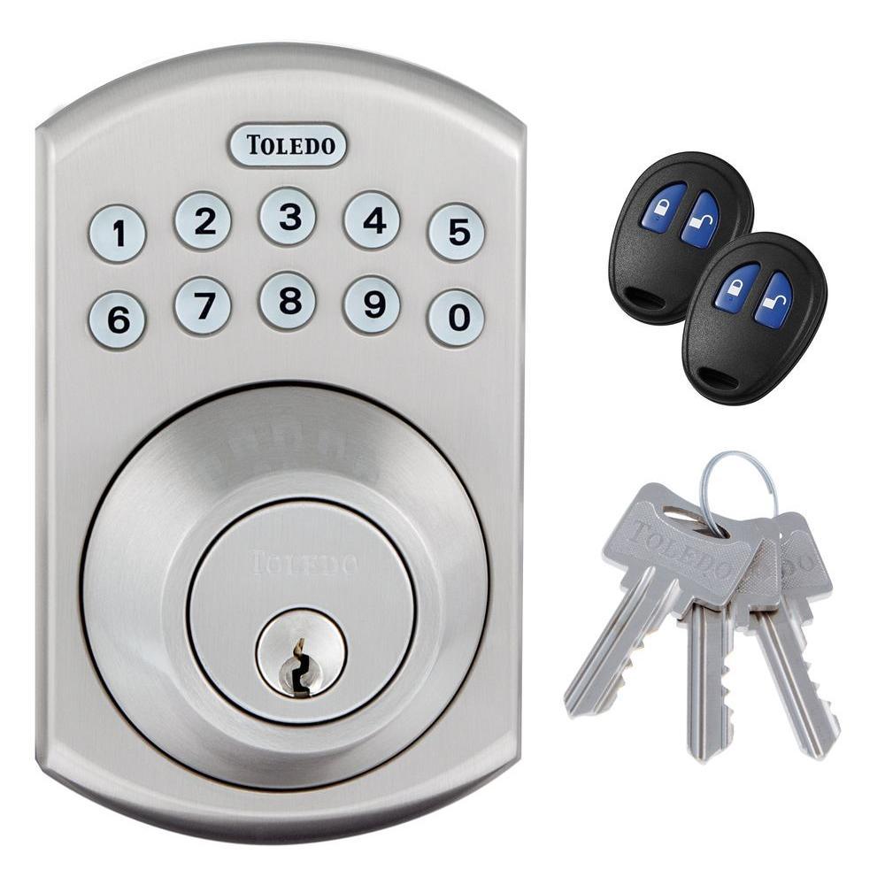 Toledo Electronic Stainless-Steel Deadbolt with Remote Control is a combination of the latest technology and traditional craftsmanship. It features an Anti-Bump System in its cylinder for added security. Enjoy convenient keyless entry with the two remote controls or use one of the 3 keys included. Manage its auto lock feature to delay it closing timing. Fits standard backsets from 2 3/8” (60mm) to 2 3/4” (70) mm. Metal or wood door thickness of 1 3/8” a 2” (35mm-51mm) and diameter door face hole: 2 1/8” (54mm) deadbolt latch hole diameter 1” (25.4mm). Not intended for gates. Requires 4 AA alkaline batteries. Make an upgrade to your home security with this durable electronic lock. this lock has a lifetime warranty.