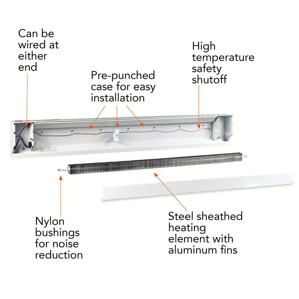 The Cadet Electric Baseboard Heater utilizes convection heat to provide efficient warmth. The quiet operation, and low cost installation make it a perfect choice for a bedroom or any area of your home that requires additional warmth. Designed for ease of installation with pre-punched mounting holes, this hardwired heater can be wired at either end. Rugged U.S.A steel construction with powder coated white paint for a durable, premium finish. A thermostat is required and sold separately.