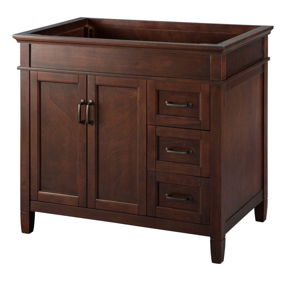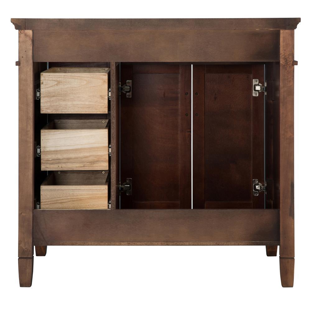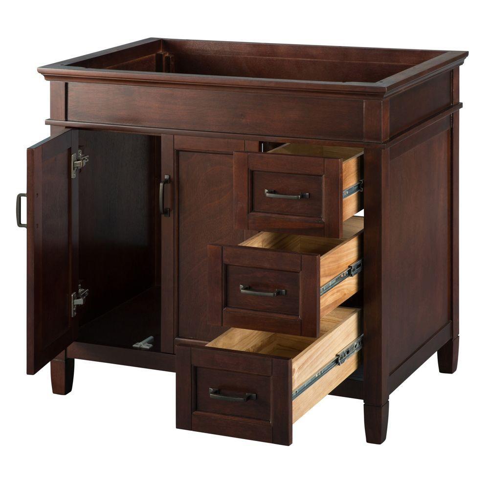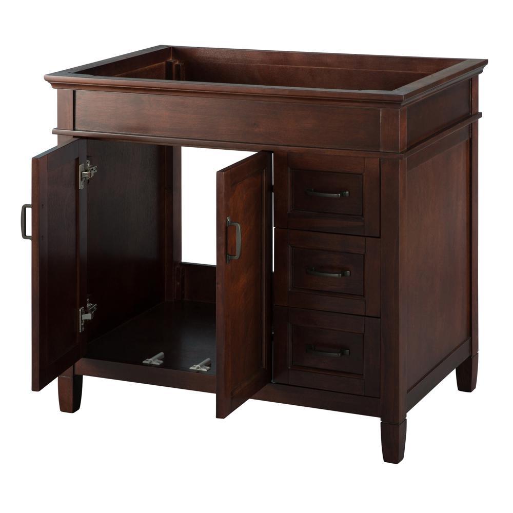 Enrich your bathroom ambience with this upscale 36 in. mahogany vanity that is more affordable than it looks. With a rich, dark finish and a clean, sleek profile, this modern piece has an understated elegance that will impress homeowners and guests alike. Two cabinet doors with soft-stop bumpers and three right-side drawers open up a bevy of storage options for linens and bath essentials, setting the tone for a tidy powder room. The sturdiness and craftsmanship of this vanity cabinet will make you think it is custom-built, while small details like leg levelers instill confidence for perfectly stable setups. Browse through the Foremost Ashburn collection for complementary mahogany items like wall cabinets and mirrors for a complete bathroom makeover.