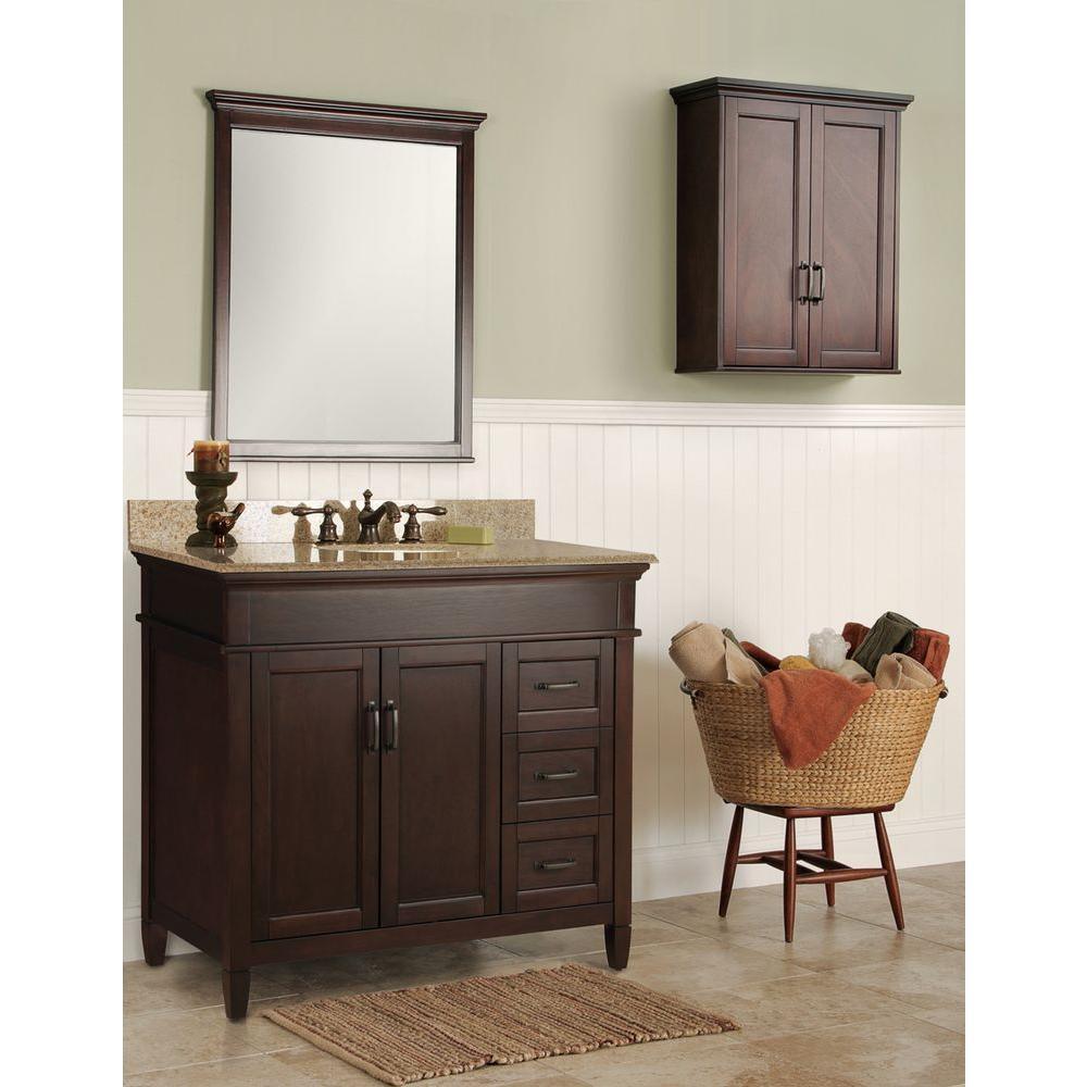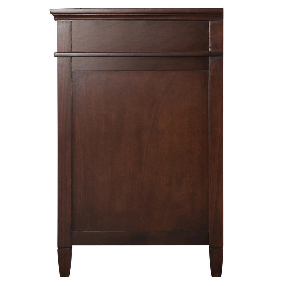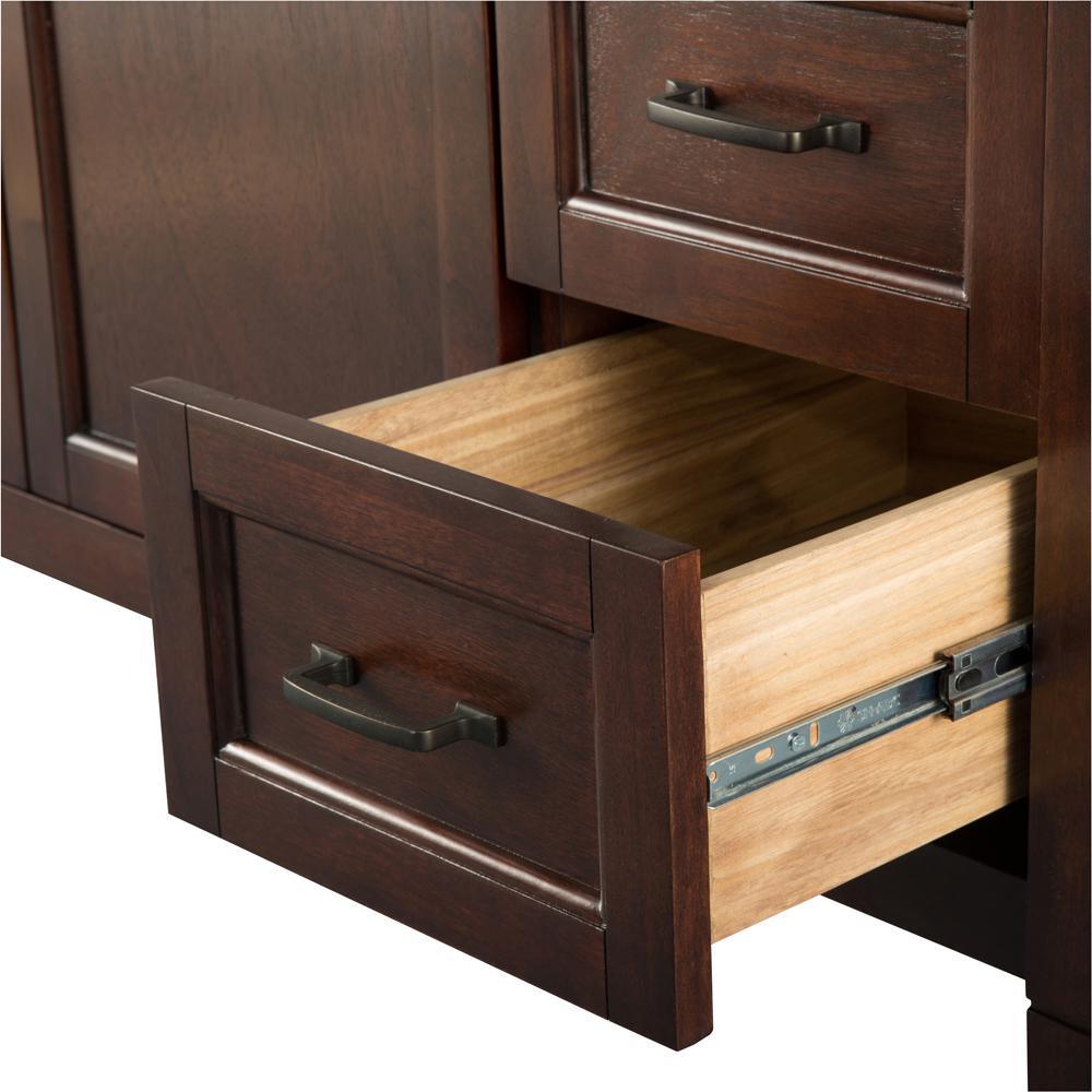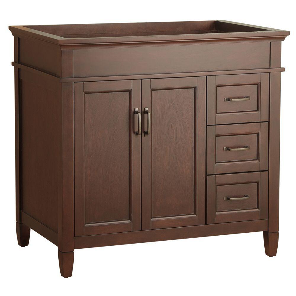 Enrich your bathroom ambience with this upscale 36 in. mahogany vanity that is more affordable than it looks. With a rich, dark finish and a clean, sleek profile, this modern piece has an understated elegance that will impress homeowners and guests alike. Two cabinet doors with soft-stop bumpers and three right-side drawers open up a bevy of storage options for linens and bath essentials, setting the tone for a tidy powder room. The sturdiness and craftsmanship of this vanity cabinet will make you think it is custom-built, while small details like leg levelers instill confidence for perfectly stable setups. Browse through the Foremost Ashburn collection for complementary mahogany items like wall cabinets and mirrors for a complete bathroom makeover.