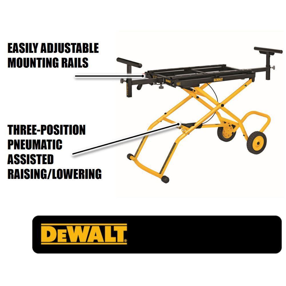 A must-have for easy portability of your miter saw, the DEWALT 32-1/2 in. x 60 in. Rolling Miter Saw Stand features durable tubular steel construction for long-lasting use. With a 300 lb. weight capacity and 8 ft. material accommodation, this stand is sturdy and strong and has rubber wheels for convenient transport. Perfect for use on the jobsite or in your workshop or garage, this stand is easily adjustable to suit your application's needs.