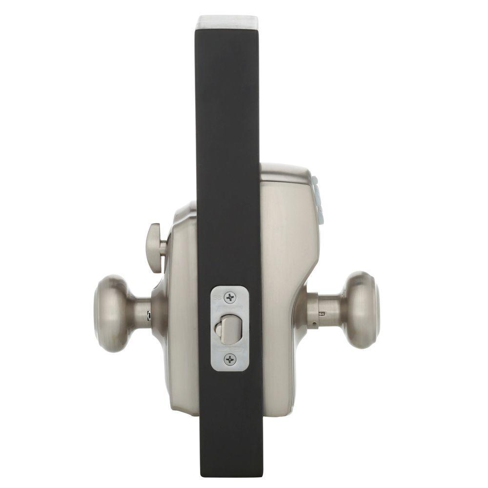 Eliminate the hassle of house keys with the Schlage Georgian Satin Nickel Keypad Electronic Door Knob with Camelot Trim Featuring Flex Lock. With this electronic door knob, you can control entry to your home more easily and securely, and our Flex-Lock feature allows you to set the lock to automatically re-lock after 5 seconds of inactivity. The LED backlight keypad is able to hold up to 19 different user codes for your convenience, and features a low battery indicator. Also, this electronic keypad runs on a single 9-volt battery, which is included. All in a slim profile and stylish trim that pairs perfectly with interior hardware. The modest Georgian knob features symmetrical detailing throughout, while the Camelot trims scalloped architectural details make any room charming and approachable. The knob is especially versatile when wrapped in our Satin Nickel finish. Plus, it's been designed and tested with strength and durability in mind.