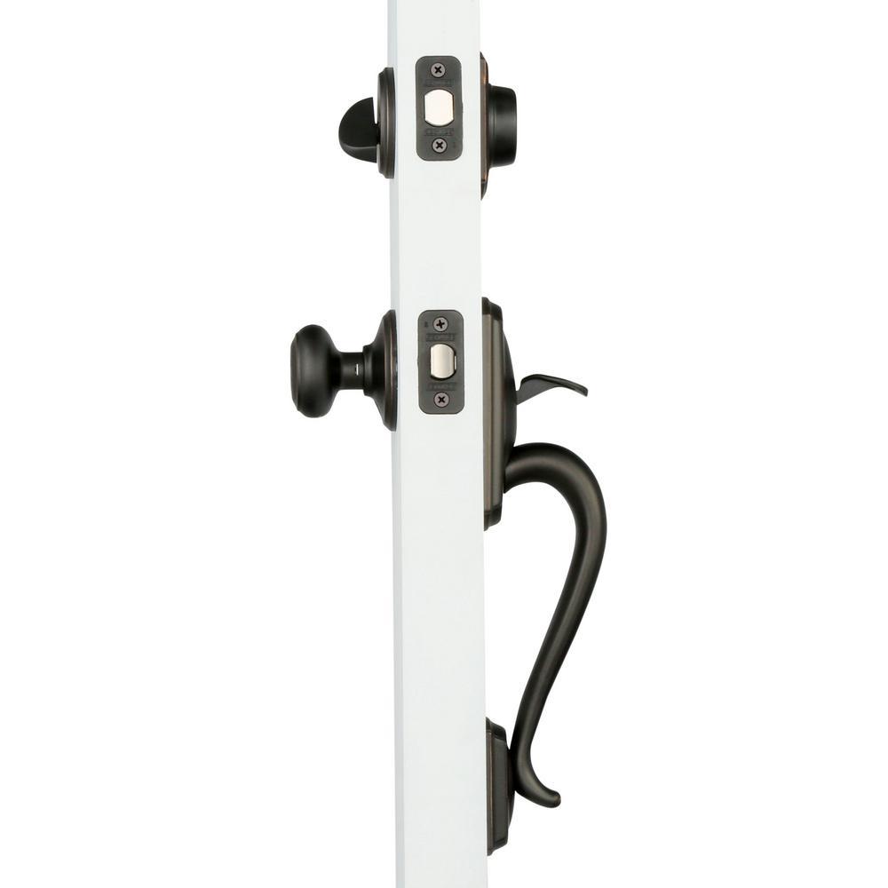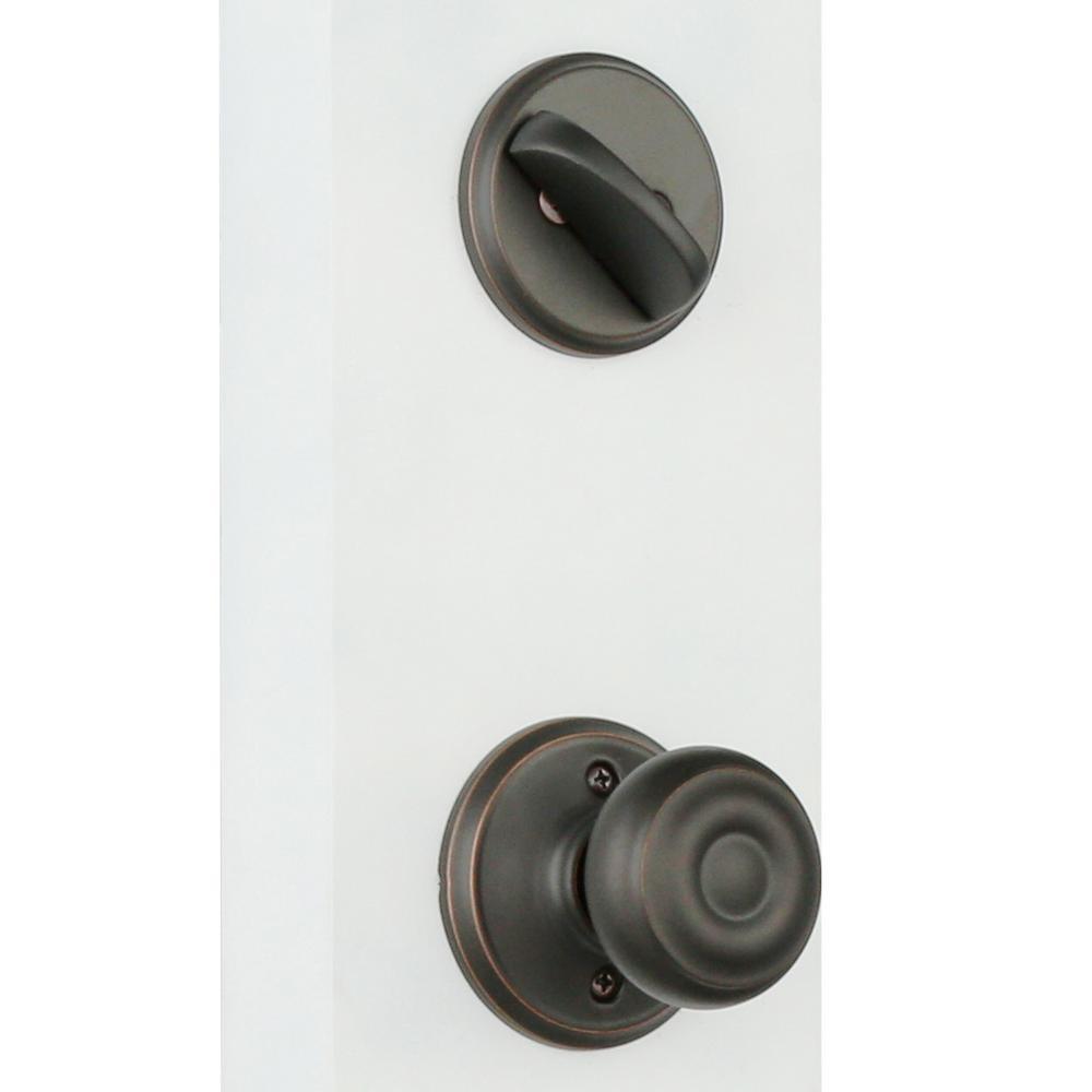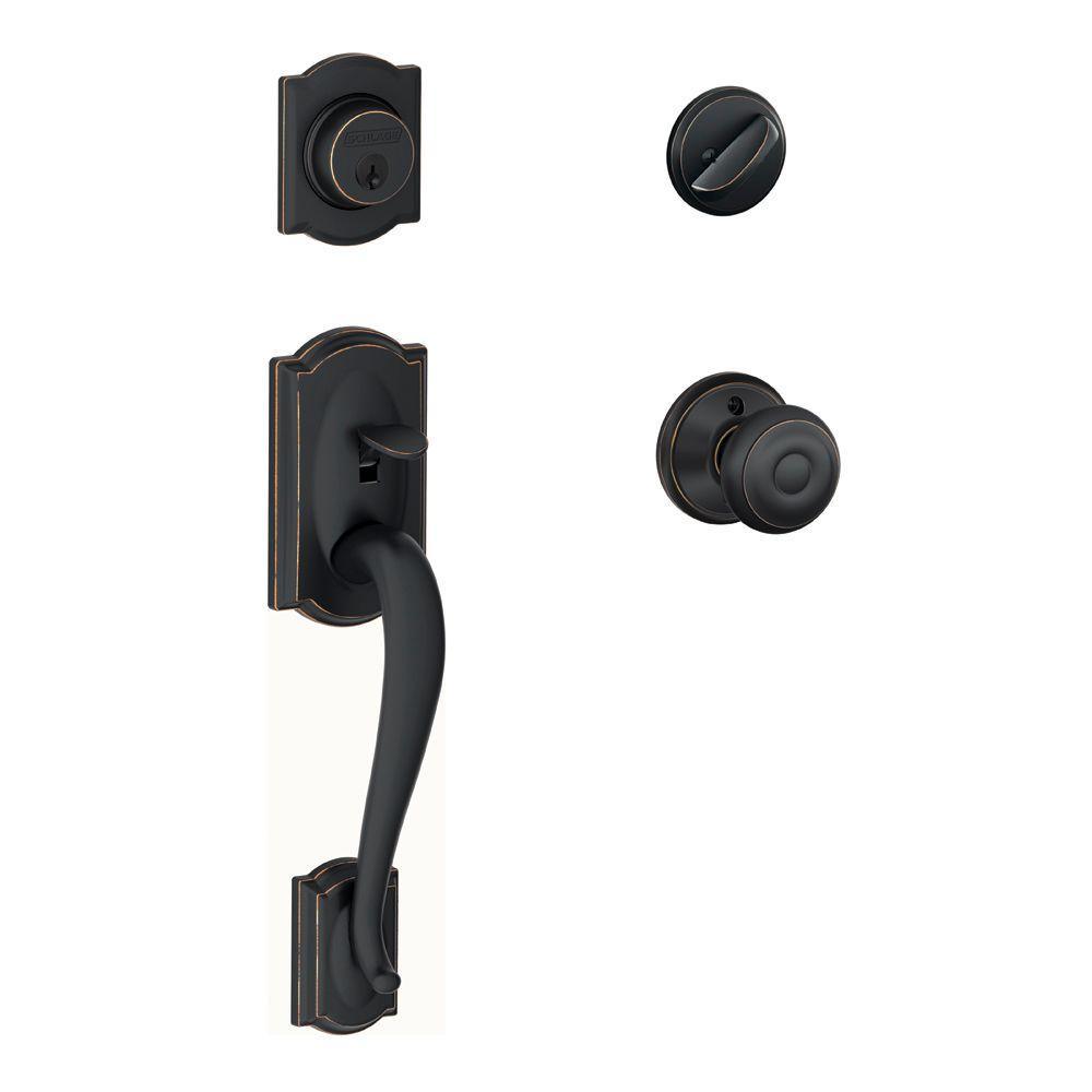 The Schlage Camelot Aged Bronze Single Cylinder Deadbolt with Georgian Knob Door Handleset is perfect for use on exterior front doors. The modest Georgian knob features symmetrical detailing throughout, while the Camelot handleset's scalloped architectural details make any room charming and approachable. Our Aged Bronze finish is inspired by traditional design, featuring warm, copper tones that break through its darker, aged exterior. Plus, it's been designed and tested with strength and durability in mind.