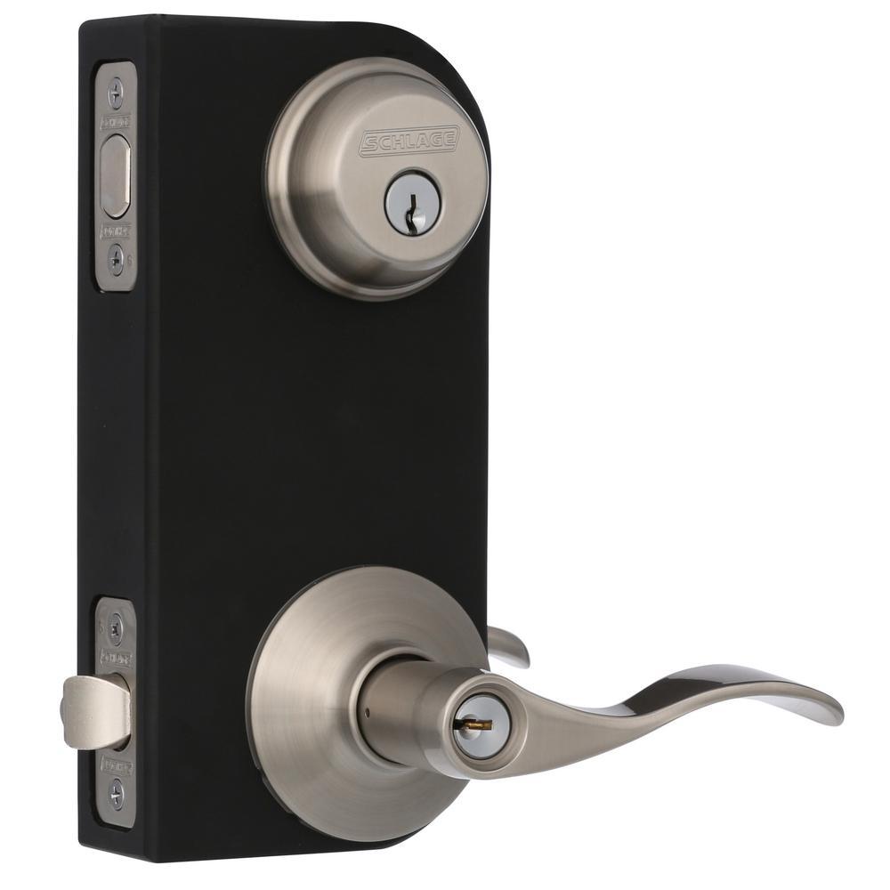The Schlage Accent Satin Nickel Single Cylinder Deadbolt with Entry Door Lever Combo Pack is perfect for use on exterior doors where extra security is needed. The Accent lever features an elegant wave-like design that effortlessly matches any room's style, and the deadbolt adds an extra layer of Grade 1 security. When finished in Satin Nickel, the lever offers a tasteful and flattering accent to any home. The lever unlocks when the door is opened from the inside, allowing you to leave quickly and conveniently and re-enter easily. Plus, it was designed and tested with strength and durability in mind.