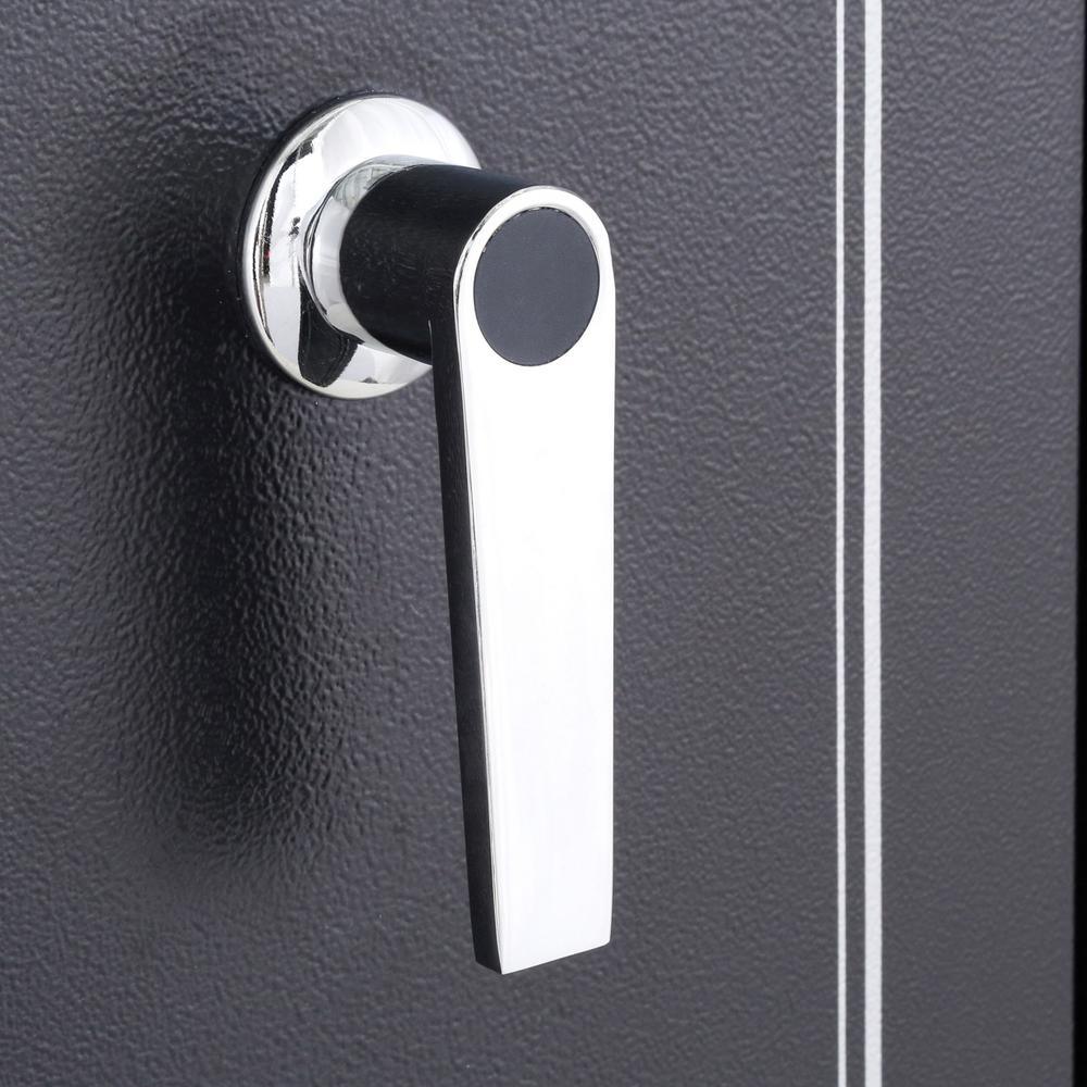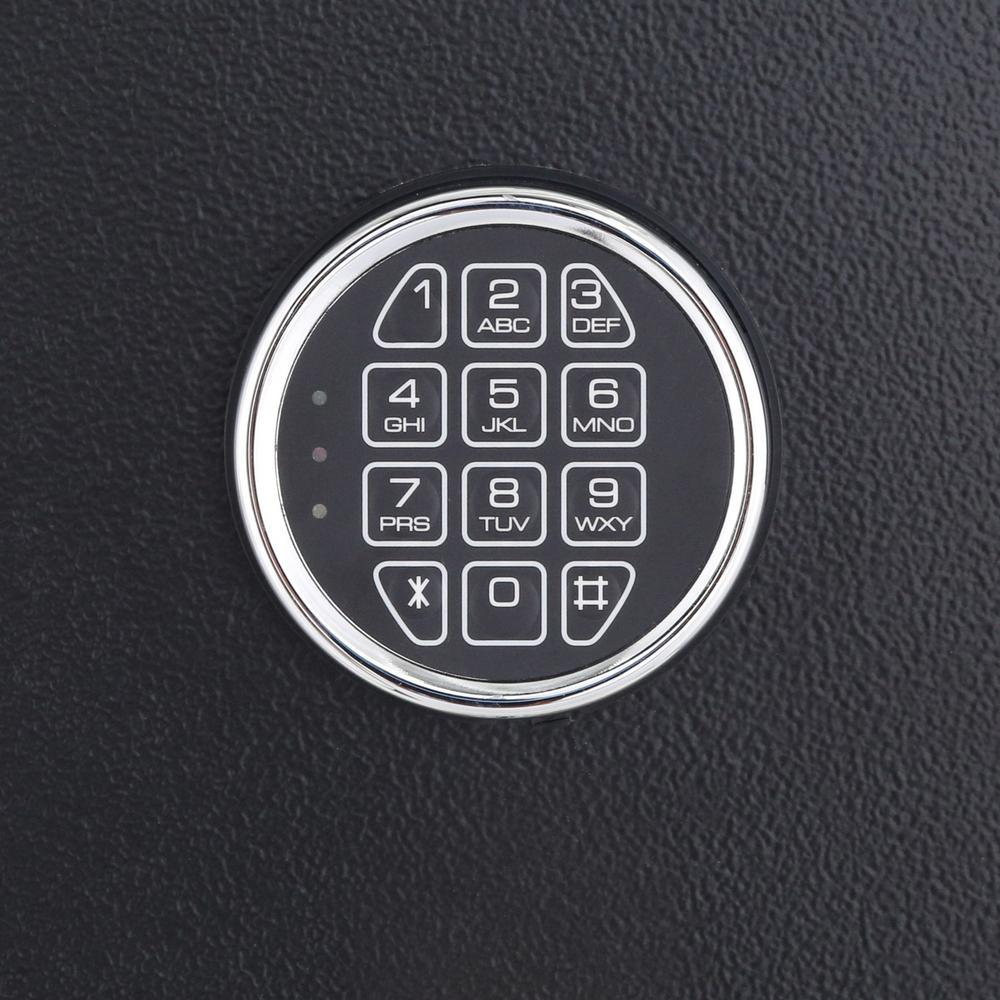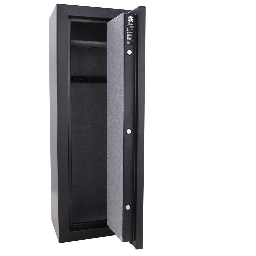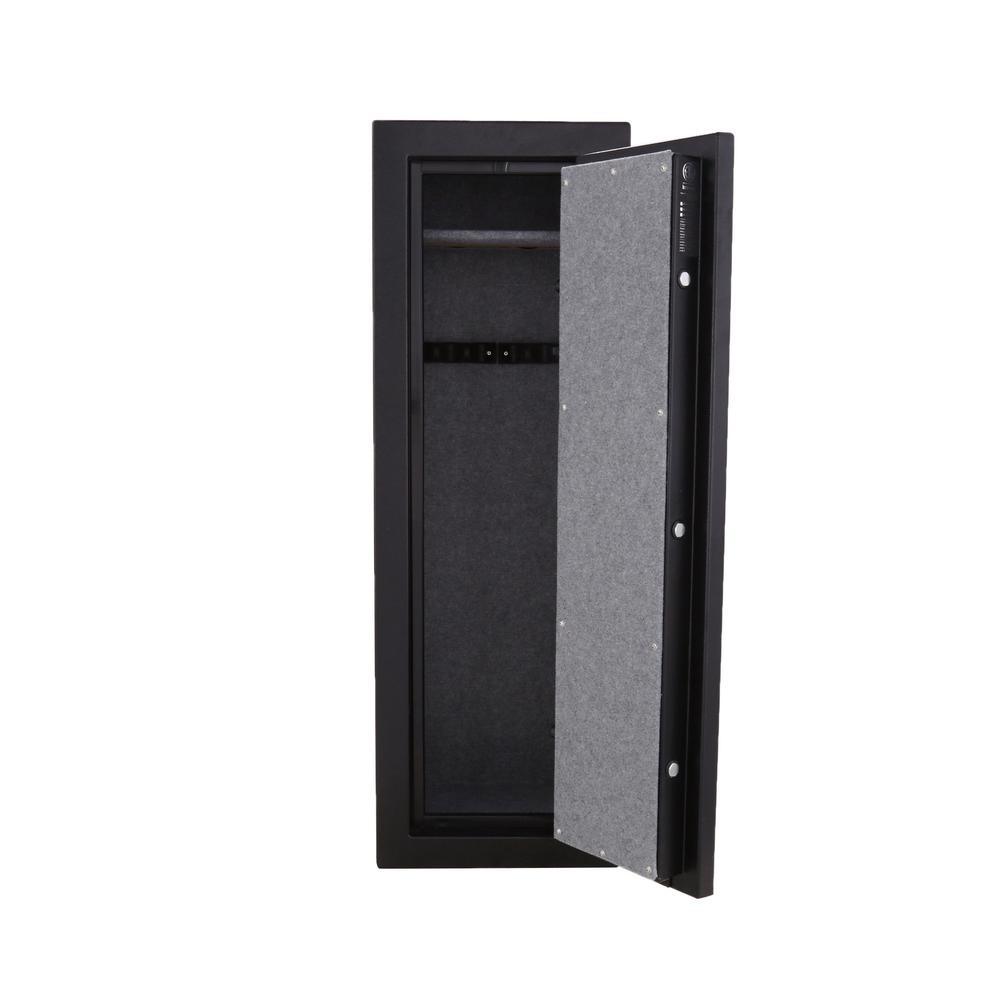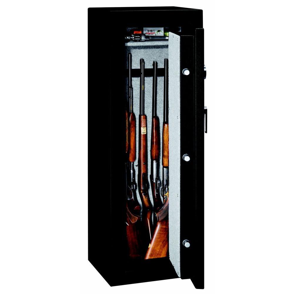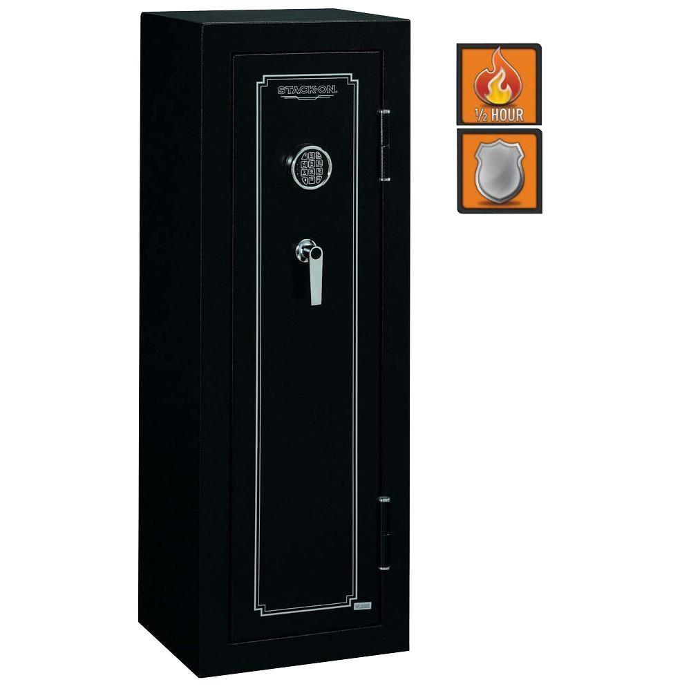 8-Gun Fire Rated Safe with Electronic Lock. This safe is Fire resistant up to 1400 for 30 minutes to protect important papers and other valuables. The exterior has a Matte Black finish with chrome accents.