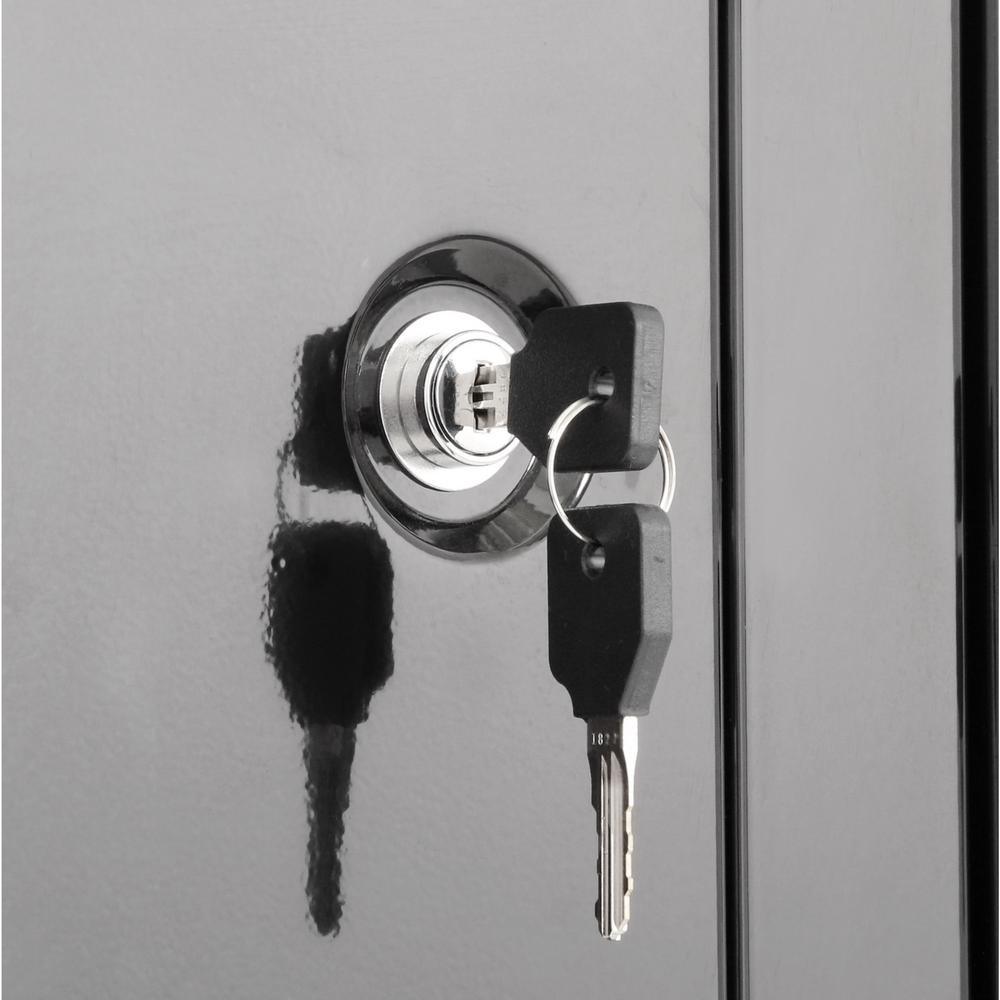 Reinforced, full-sized steel door with three-point locking system with key coded, double-bitted lock for greater security
