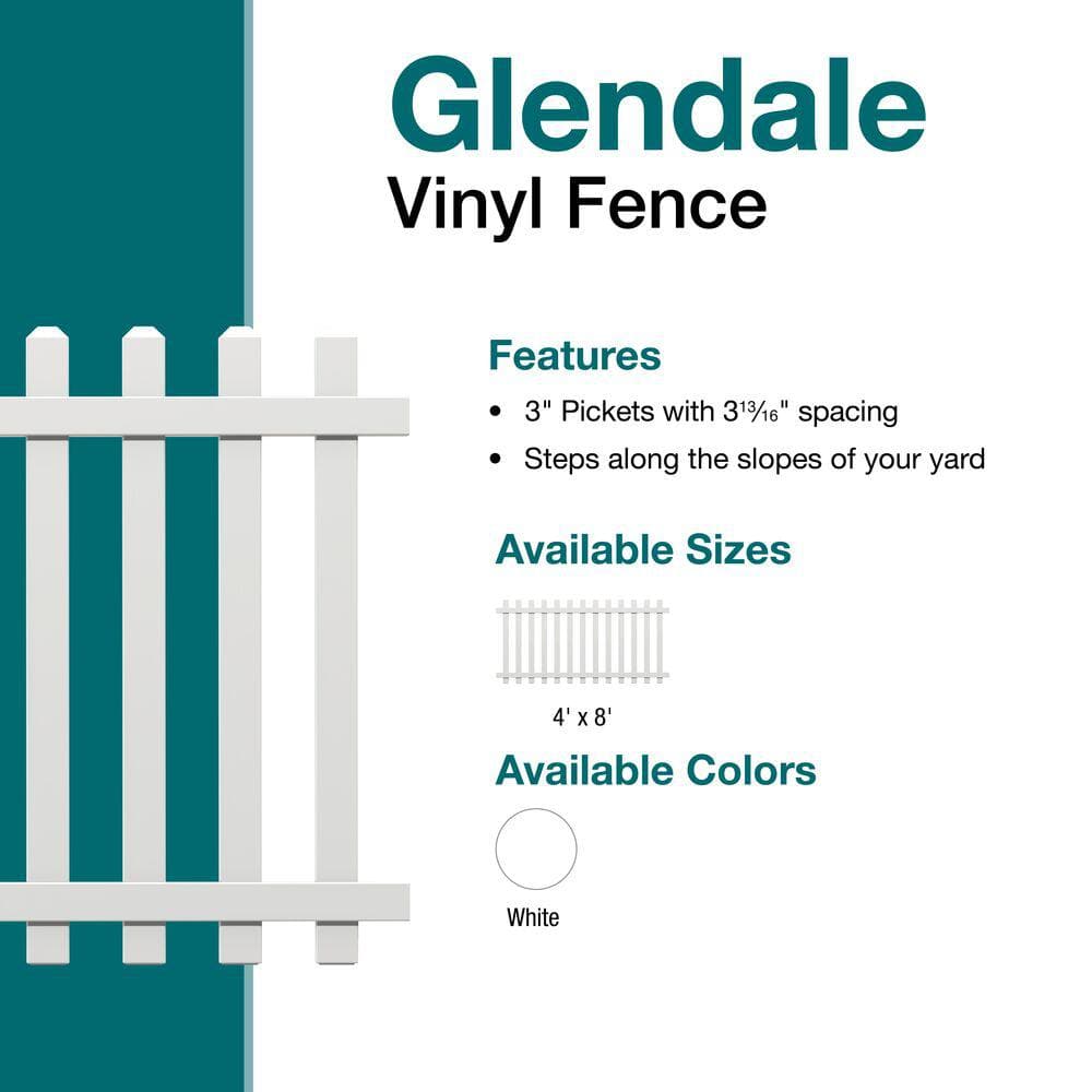 A durable, low-maintenance vinyl picket fence panel designed for classic curb appeal. The 4 ft. x 8 ft. Glendale panel features pointed pickets and a spaced design that steps along sloped terrain, resisting rot, insects, and fading.