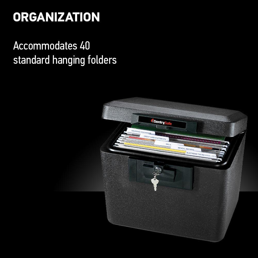 Spacious interior: Large file safe fits wherever you need and holds hanging file folders; Interior: 10.4 in. H x 12 in. W x 8.5 in. D, exterior: 13.6 in. H x 15.3 in. W x 12.1 in. D