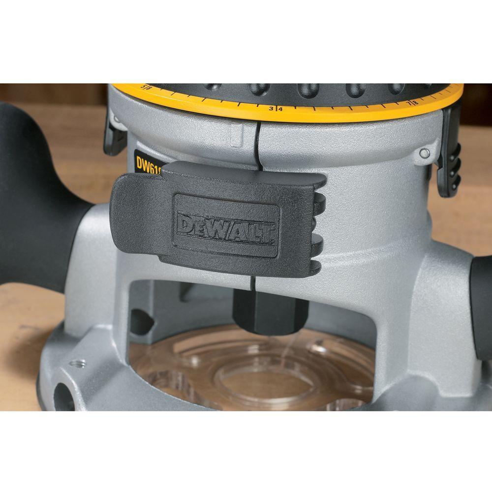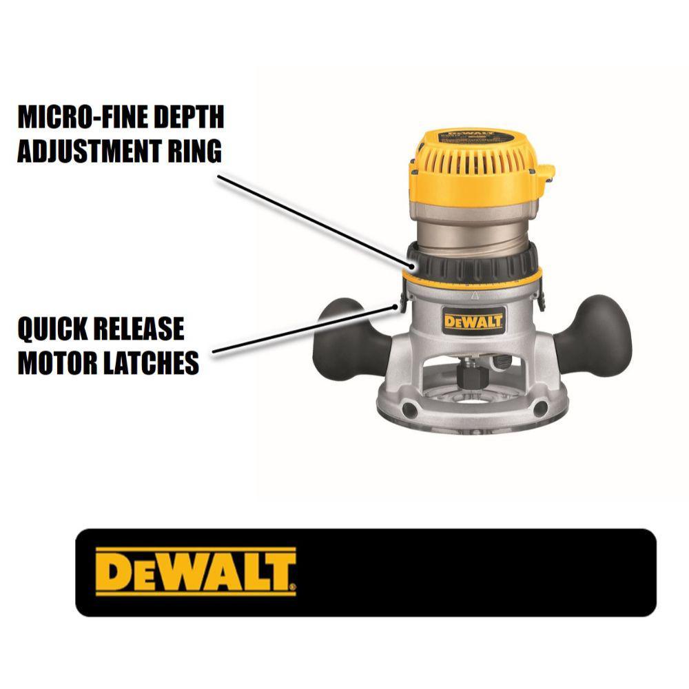 The DEWALT 2-1/4 HP EVS Fixed Base Router with Soft Start offers all the power and versatility that professionals demand with its 12 amp motor with variable speed from 8000 to 24,000 RPM and soft start for extra-smooth finishes and exceptional performance when working with even the toughest hardwoods. With the micro-fine depth adjustment ring, you can count on accurate adjustment in 1/64 in. increments, while the clear LEXAN sub-base ensures durability and enhanced visibility. Comfortable to use with overmold rubber handles and a well-balanced body, the unique switch and cordset configuration allows you to keep the switch in your right or left hand, while a flat top and spindle lock further increase the ease of bit and depth changes.