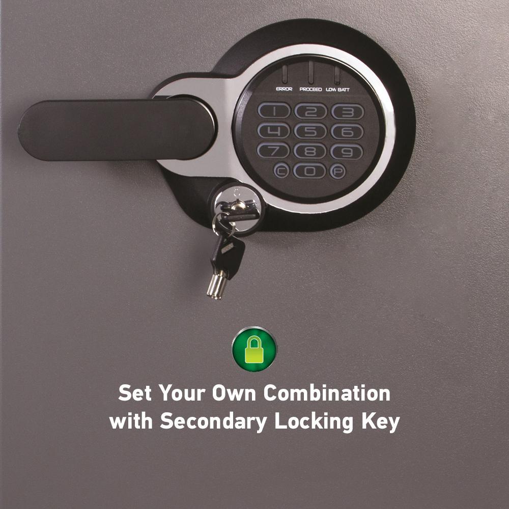 • Set your own digital combination fire safe with secondary locking key for strong security; digital combination safe features four live-locking bolts, steel construction, pry-resistant hinge bar, tray, interior light, and bolt down hardware
