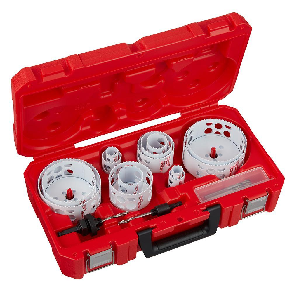 Includes 14 hole saw sizes, 3/4 in., 7/8 in., 1-1/8 in., 1-3/8 in., 1-1/2 in., 1-3/4 in., 2 in., 2-1/4 in., 2-1/2 in., 2-5/8 in., 3 in., 3-5/8 in., 4-1/8 in. and 4-3/4 in., 2 arbors, 5 total pilot bits, hex key and case