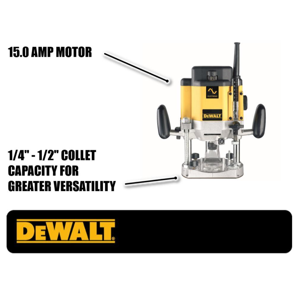 With a smooth running, 15 amp motor, this router from DeWalt features state of the art electronic circuitry with soft start, variable speeds from 8,000 to 22,000 rpm, and constant speed under load to ensure a quality finish in all materials. The rack-and-pinion depth adjuster, magnified scale, and microfine bit depth adjuster provide fast and accurate depth settings, the phosphorous bronze bushings give you a smooth plunge, and the spindle lock button allows one-wrench bit changes. Other features include a guide bushing adapter plate that accepts standard guide bushings for template work, a one-piece motor shaft and spindle that ensure perpendicularity and accuracy, and 1/4- and 1/2 in. collet capacity for greater versatility. This kit also includes a dust extraction adapter and wrench.