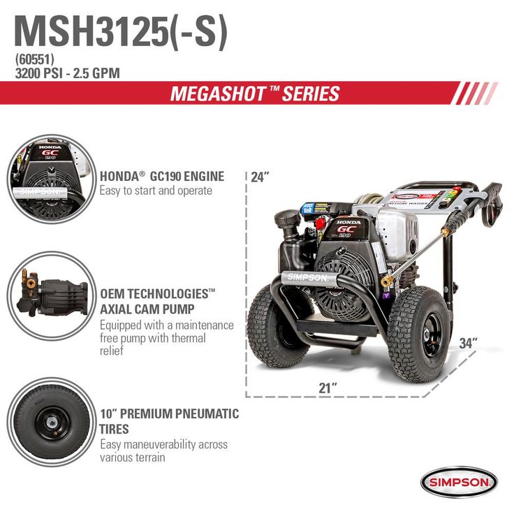 The Simpson MegaShot Series is perfect for the "Do-it-Yourselfer" looking for maximum performance with minimal investment. Simple to use and great for cleaning decks, patios, outdoor furniture, house siding and prepping home exteriors for painting. Its compact design is lightweight and small enough to be easily transported by one person. Equipped with premium HONDA, KOHLER or Simpson OHV engines built with high-quality components, designed for optimum performance and renowned for being easy to start.