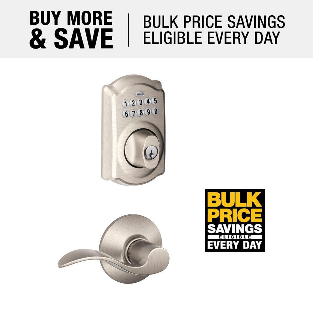 Upgrade your exterior door's convenience and curb appeal with the Schlage Camelot Satin Nickel Keypad Electronic Deadbolt and Accent Door Lever. The Schlage keypad combo pack contains a satin nickel keypad deadbolt with one hall and closet accent lever. Schlage has built a legacy of providing the highest level of security to homes and businesses. Install a Schlage, and you install nearly a century of total dedication to security, quality and innovation.