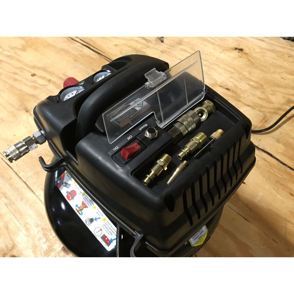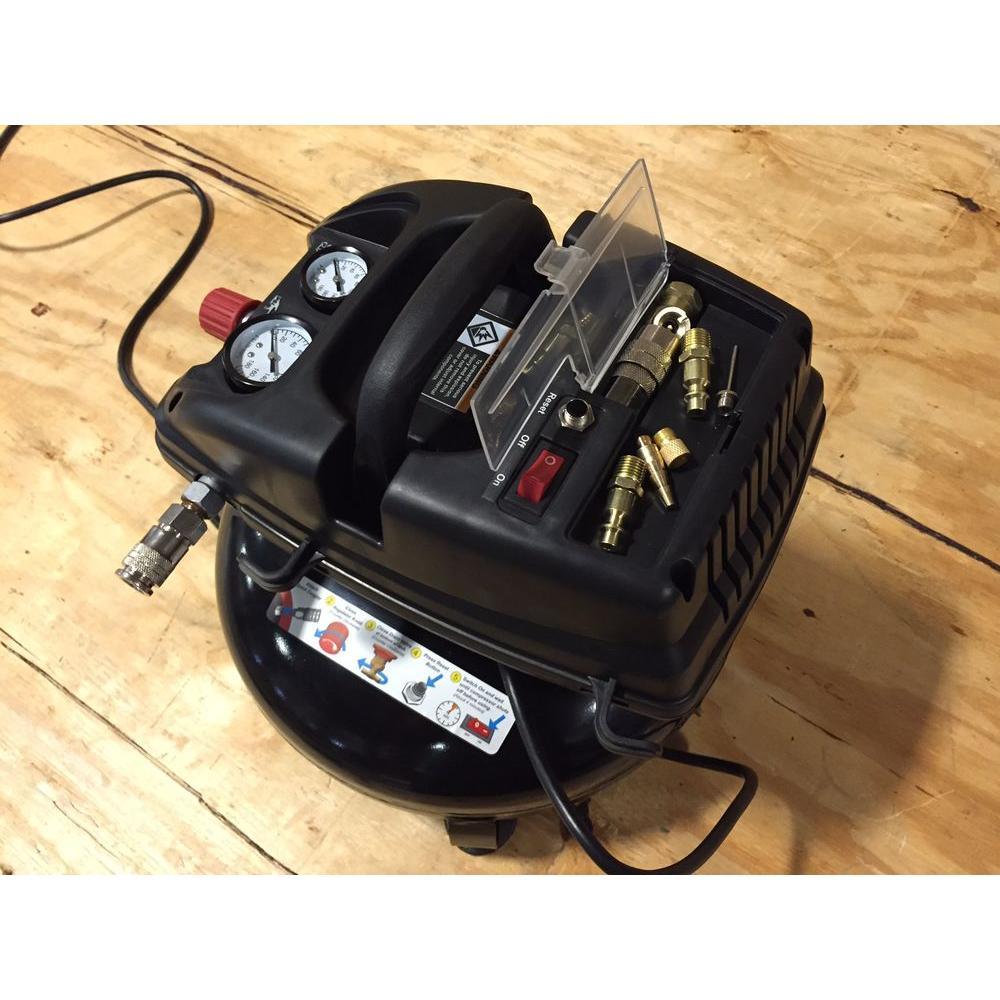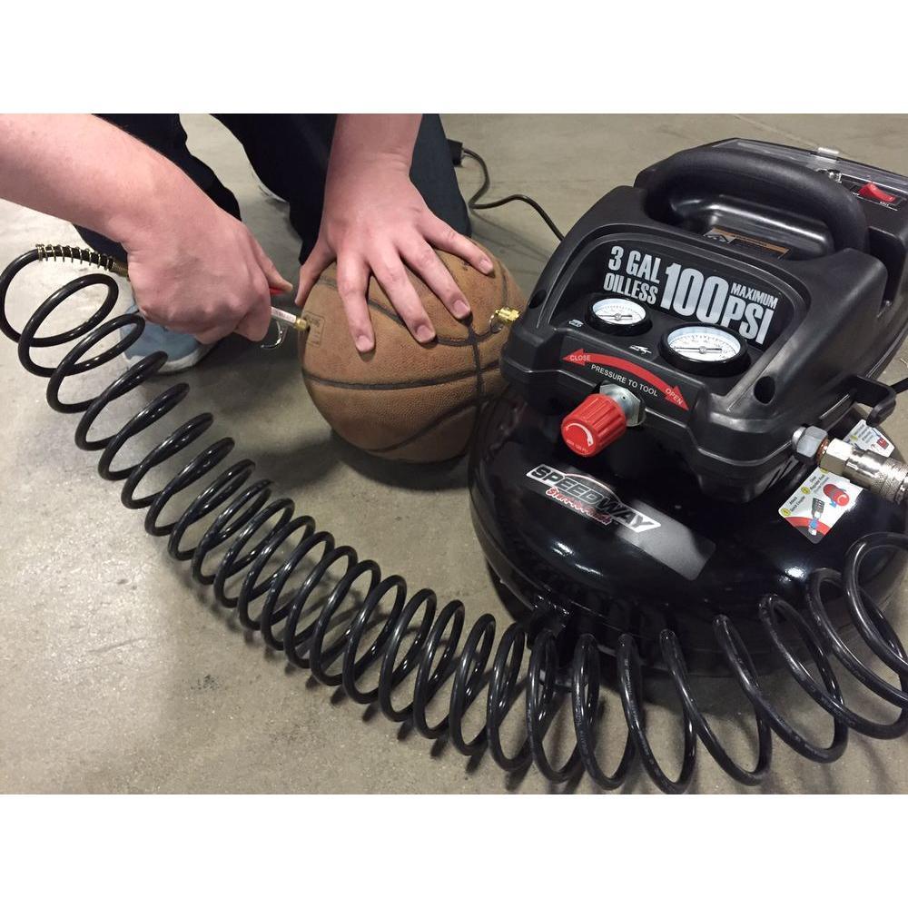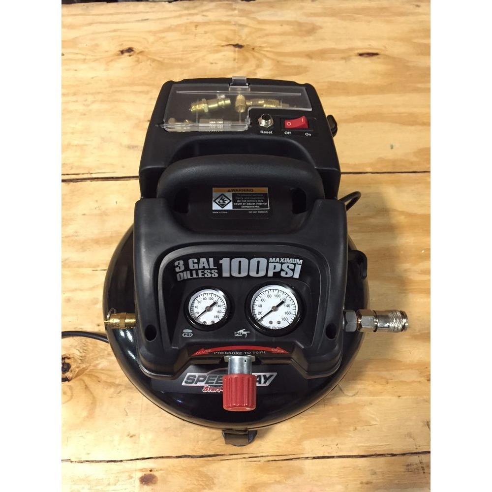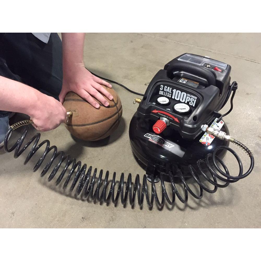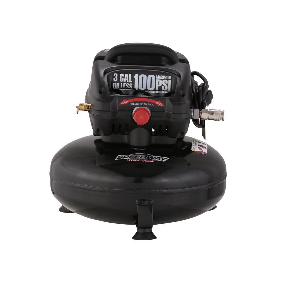 This 3 Gal. Oil-Free Compressor Kit from SPEEDWAY is ideal for the shop or garage and suits a variety of pneumatic applications. Compact and portable, the compressor offers 100 max psi and features a built-in regulator and dual gauge manifold to ensure precise tire inflation. With the convenient onboard storage feature, you can keep all your small pneumatic accessories easily within reach.