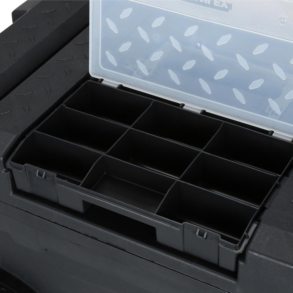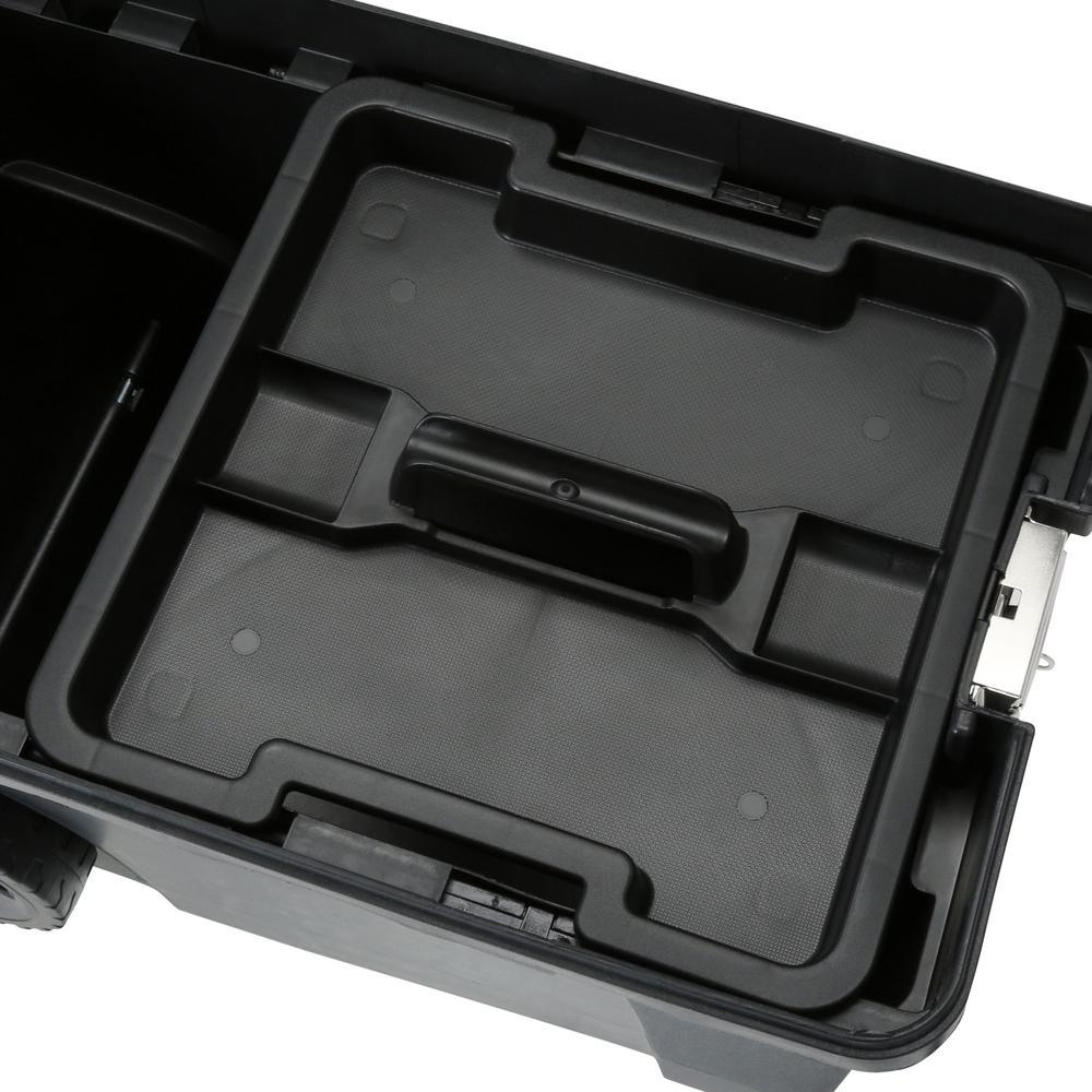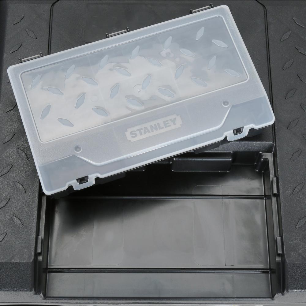 To use the removable organizer, just remove and all small parts are organized and accessible. The power tools are easily accessible from portable tray or bottom bin. The V groove on the top lid is used for onsite sawing needs. The durable metal latches connect the 2 units.