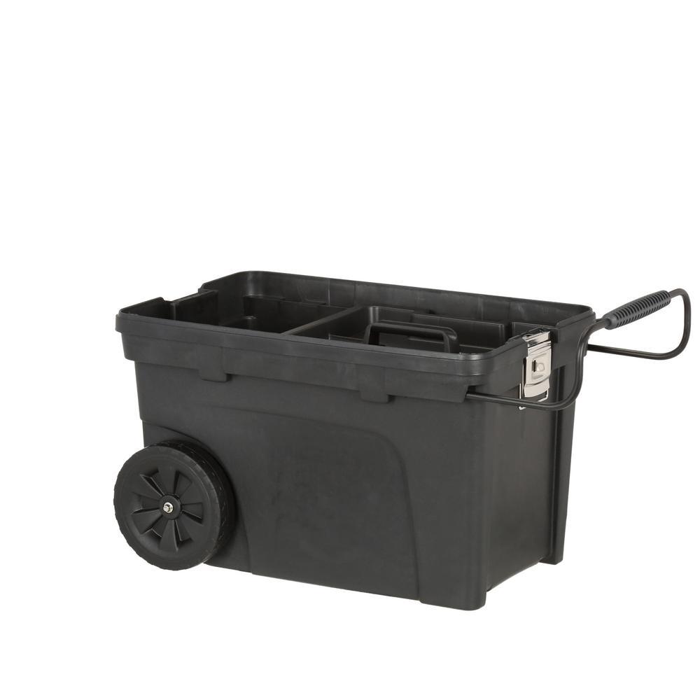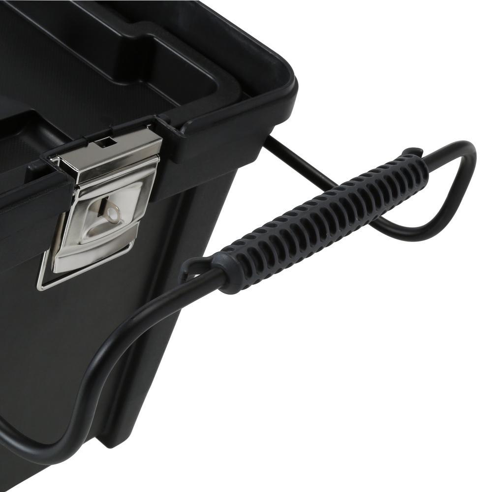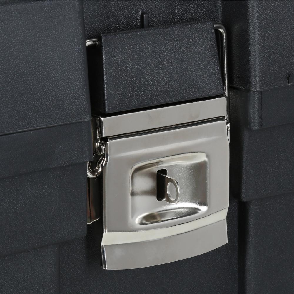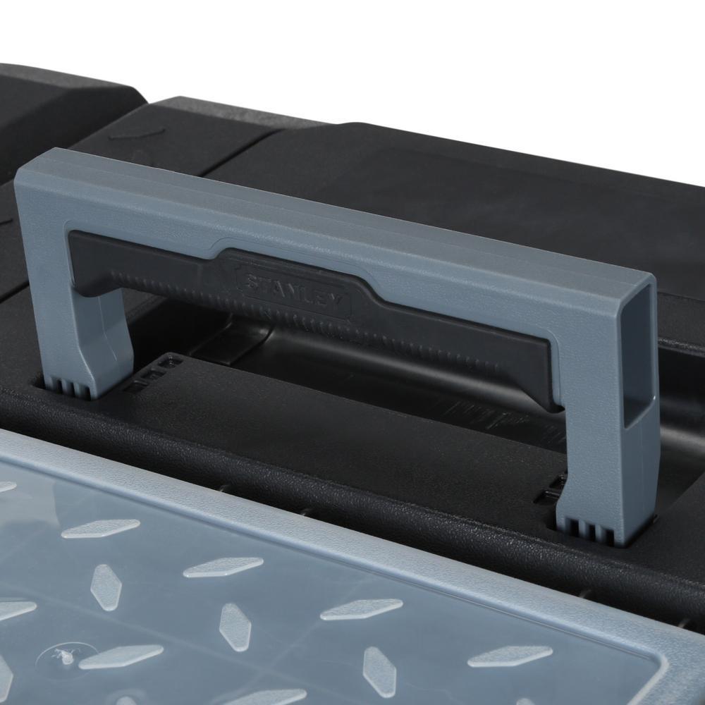 To use the removable organizer, just remove and all small parts are organized and accessible. The power tools are easily accessible from portable tray or bottom bin. The V groove on the top lid is used for onsite sawing needs. The durable metal latches connect the 2 units.