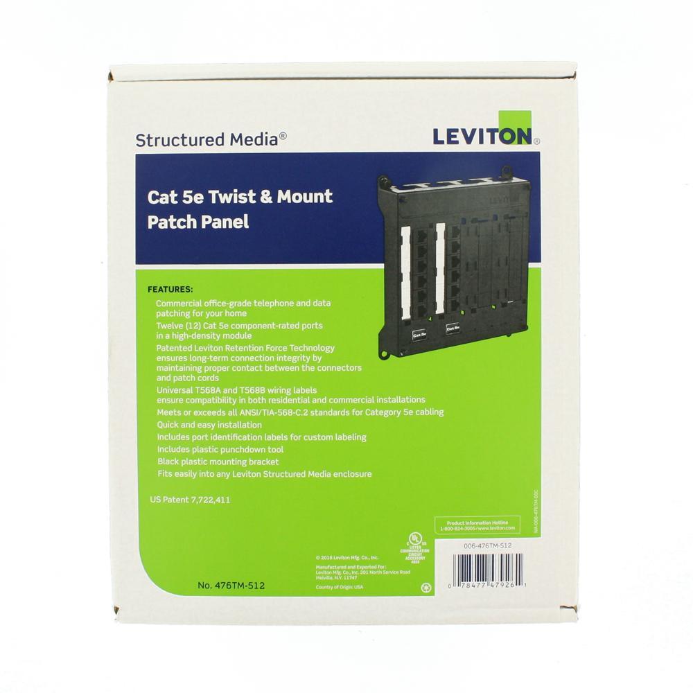 Leviton's six Twist & Mount Patch Panels are designed for use in any of Leviton's existing Structured Media Centers to support a variety of telephone and data distribution needs. These panels hold patching modules, which allow 12 ports of patching capability to CAT 5e cabling. The CAT 5e ports meet the requirements of high-speed data applications are designed for use in high megabit applications such as Gigabit Ethernet.