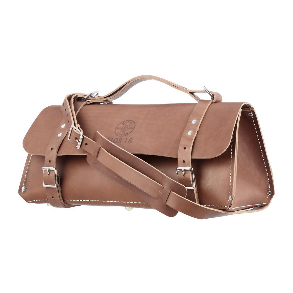 Great bag if you want to bring a select group of tools to a job and leave the rest in the box. Made of extra-heavy leather, this rugged tool bag has a three-ply bottom with steel studs for extra durability. Lightweight and portable.