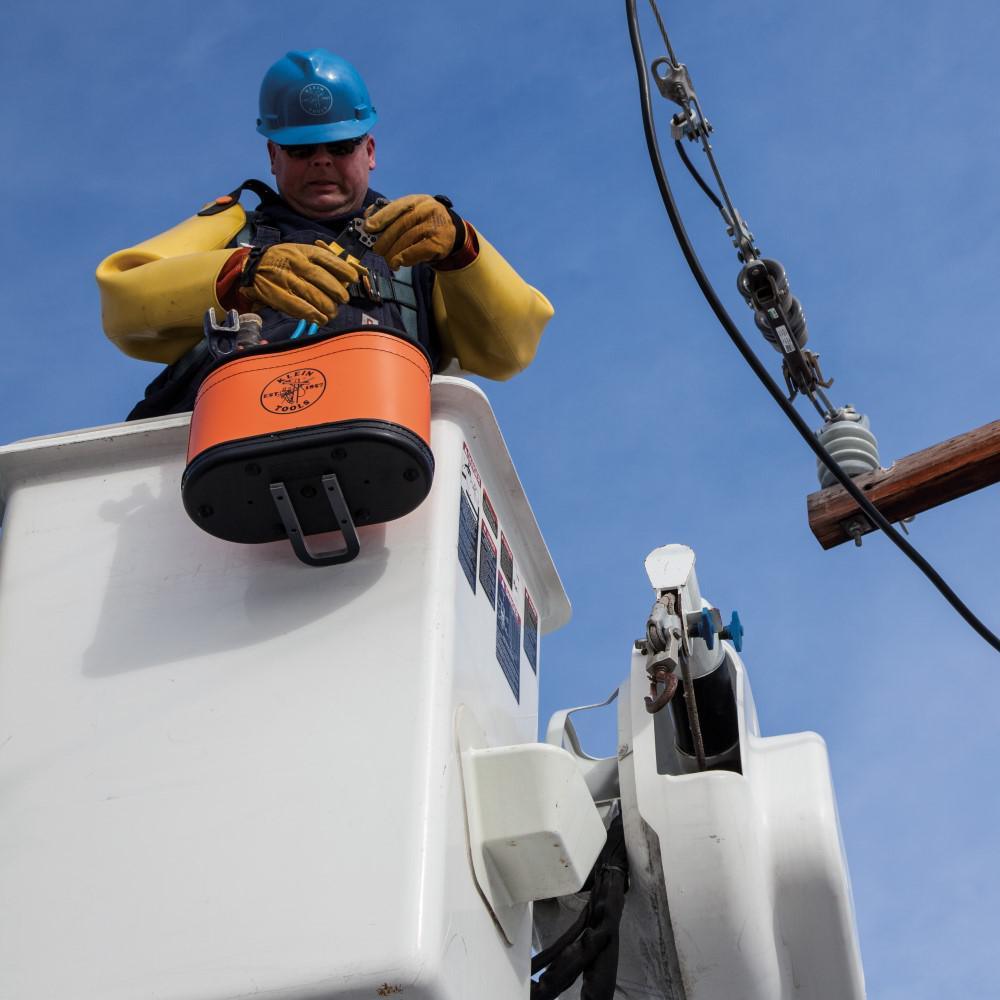 This all-purpose tool bucket transfers your tools safely and securely. Orange, non-conductive plastic exterior maintains bucket shape. This lineman bucket features 15 pockets to keep your tools organized and secure.