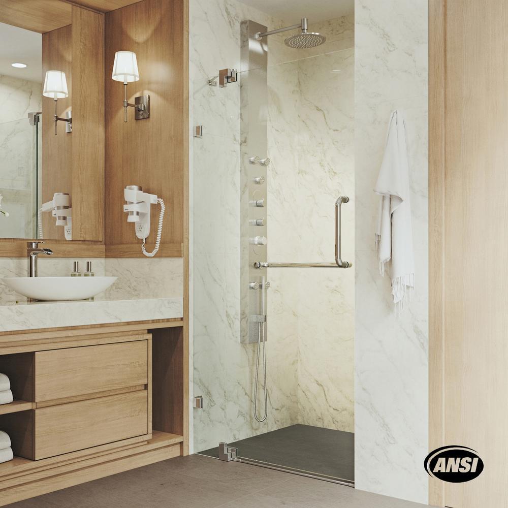 The unique pivoting door system on the VIGO Pirouette Frameless Pivot Shower Door is a safe and effective way to update your modern bathroom. Made from the highest quality 304-series stainless steel and durable tempered glass, this shower door features a sleek door handle and matching towel bar for added convenience. To your preference, this door can be installed to open from the left or right side. The towel bar and door handle are also reversible so you can customize your shower door even further. This shower door fits opening widths between 30 to 36 in.