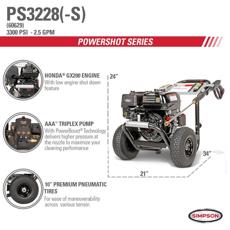 Simpson SIMPSON PowerShot PS3228-S 3300 PSI at 2.5 GPM HONDA GX200 Cold Water Pressure Washer