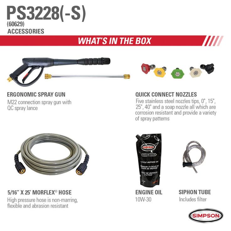 • 5 Quick connect nozzle tips: 0°, 15°, 25°, 40° and soap to use for a variety of cleaning applications