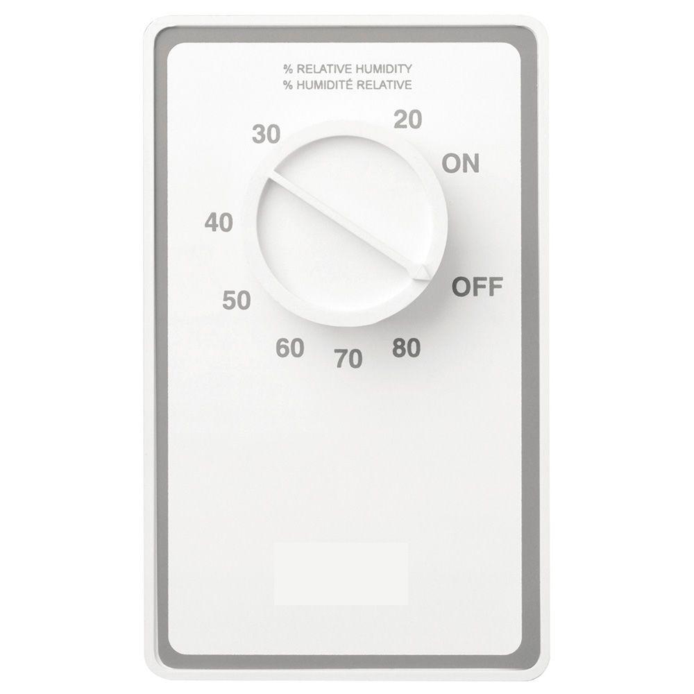 The DH100W white dehumidistat is a control switch which operates a connected fan based on the relative humidity it senses in a room. A user can set the desired humidity level and the dehumidistat control will activate or switch on the fan to ventilate the room once it detects higher humidity. The fan will remain on until the desired humidity level is reached, at which point the humidistat will shut the fan off.