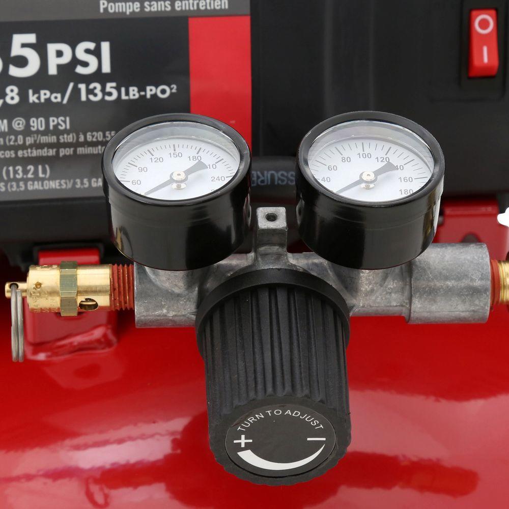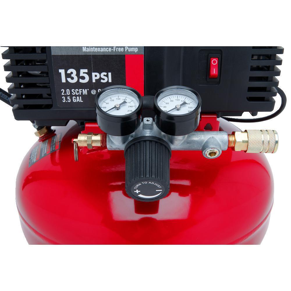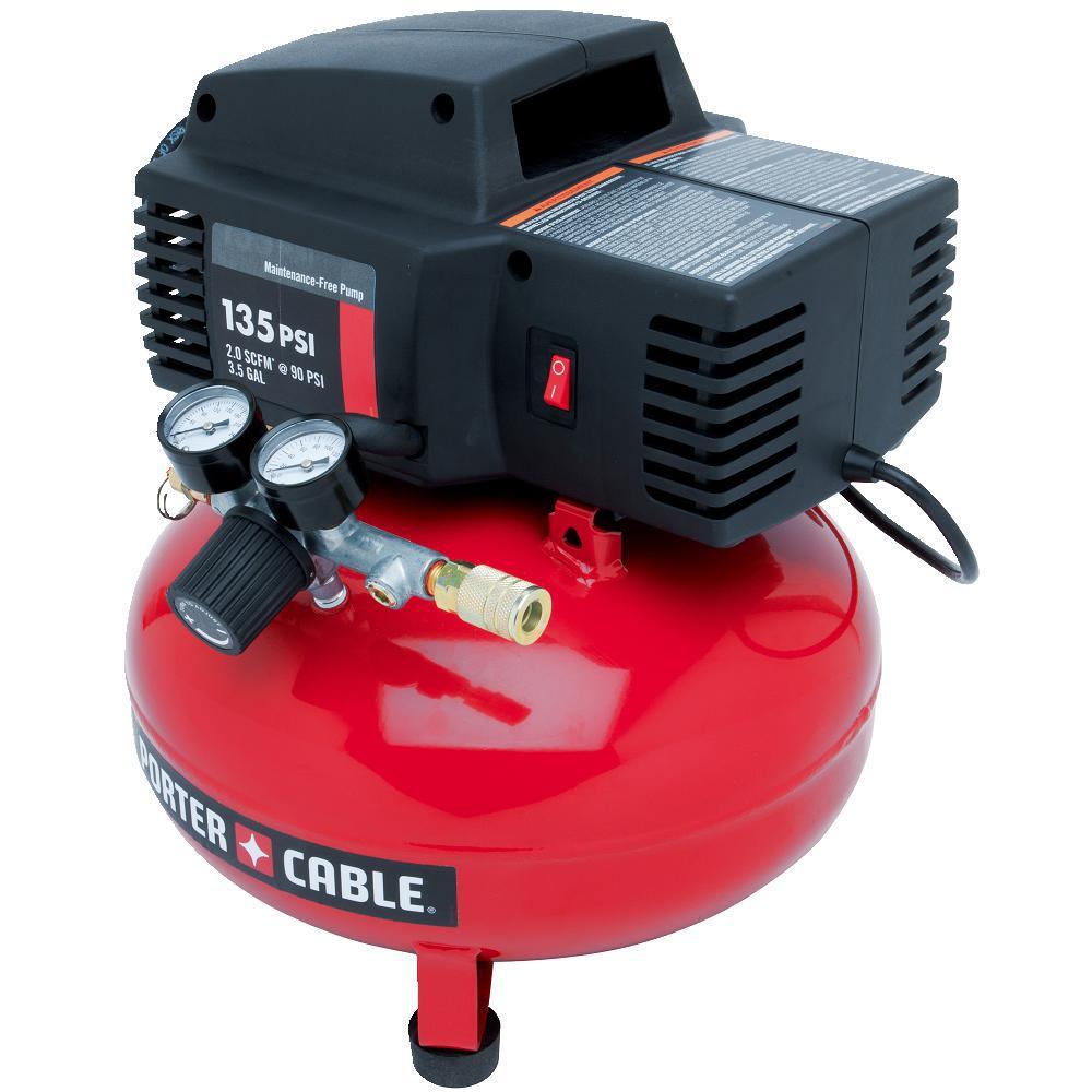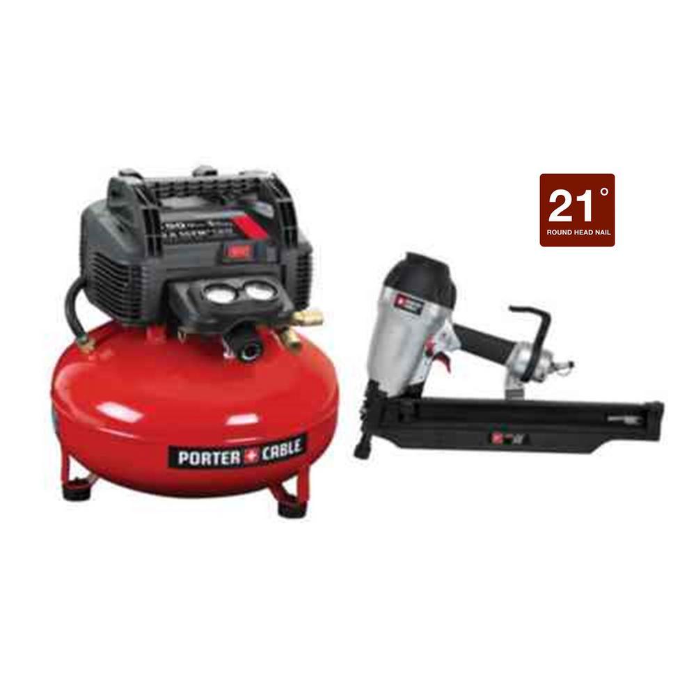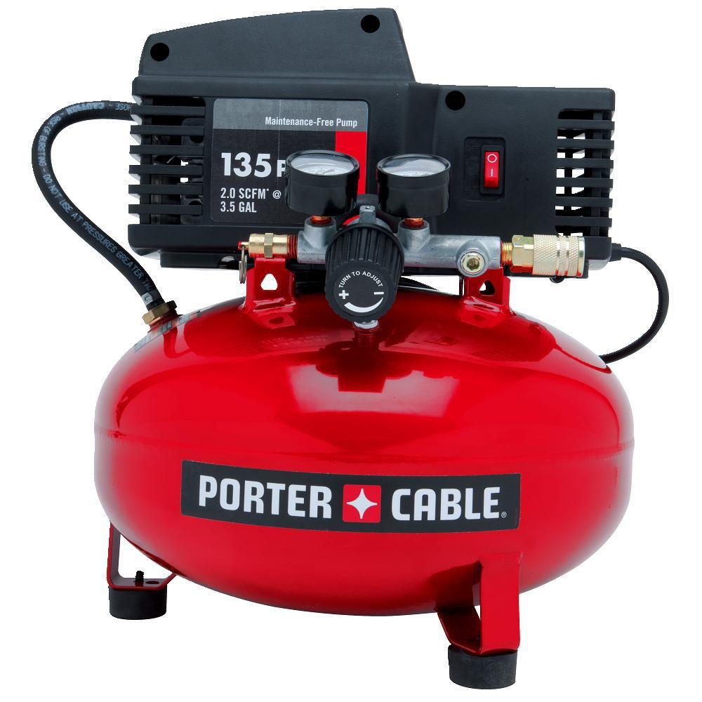 Ideal for carpenters, woodworkers and DIY-ers, the FR350B touts a variety of features including a selectable trigger allowing the flexibility to choose between restrictive or contact actuation modes. For ease of use, each of the tools are also equipped with a depth-of-drive feature, a low nail lock-out mechanism to alert the user to reload the tool and a reversible rafter hook for hanging the tool on the left or right side. Additionally, the over-molded grip provides comfort and control when working. The Porter-Cable PCFP02003 3.5 Gal. 135 psi Pancake Compressor features a durable oil-free pump for long life and no maintenance. This compressor is designed with a low Amp 120-Volt motor that starts easily in cold weather or with extension cord. Even though this compressor is built for portability at 26 lbs., it still supports multiple trim finishing nailers, small framing/roofing jobs and all general inflation, blowing and smaller SCFM air tools.
