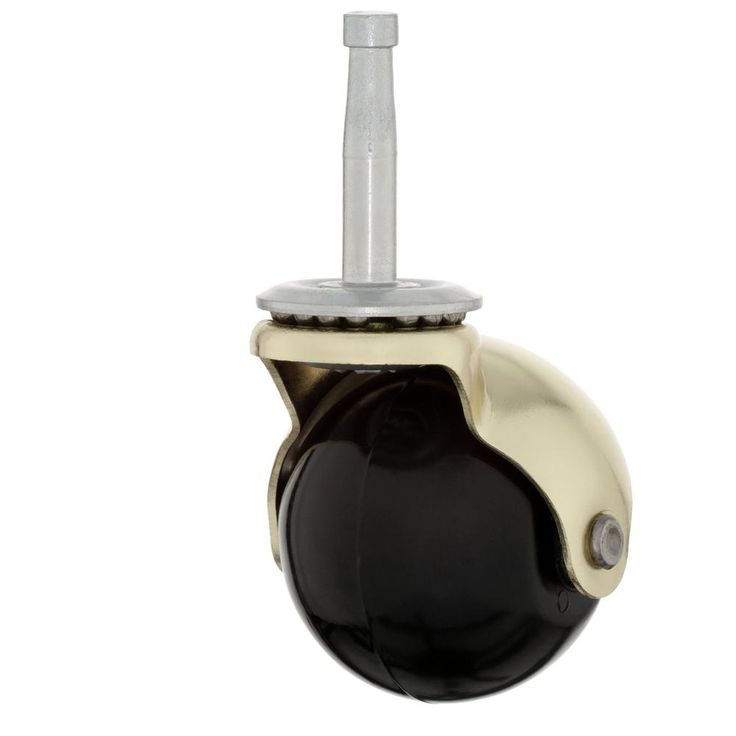 - 2 inch spherical soft black rubber wheel with double ball bearing swivel and protective hood with convenient threaded stem mount and brass finish