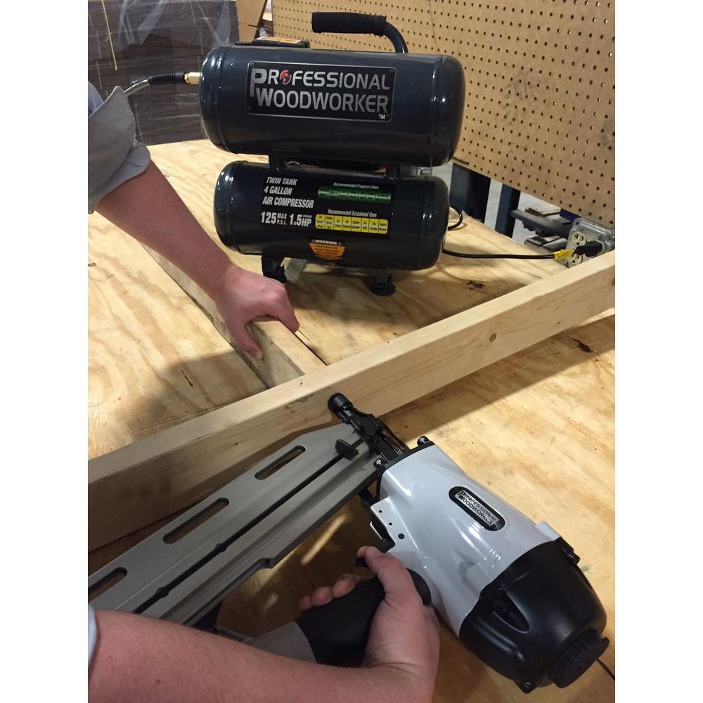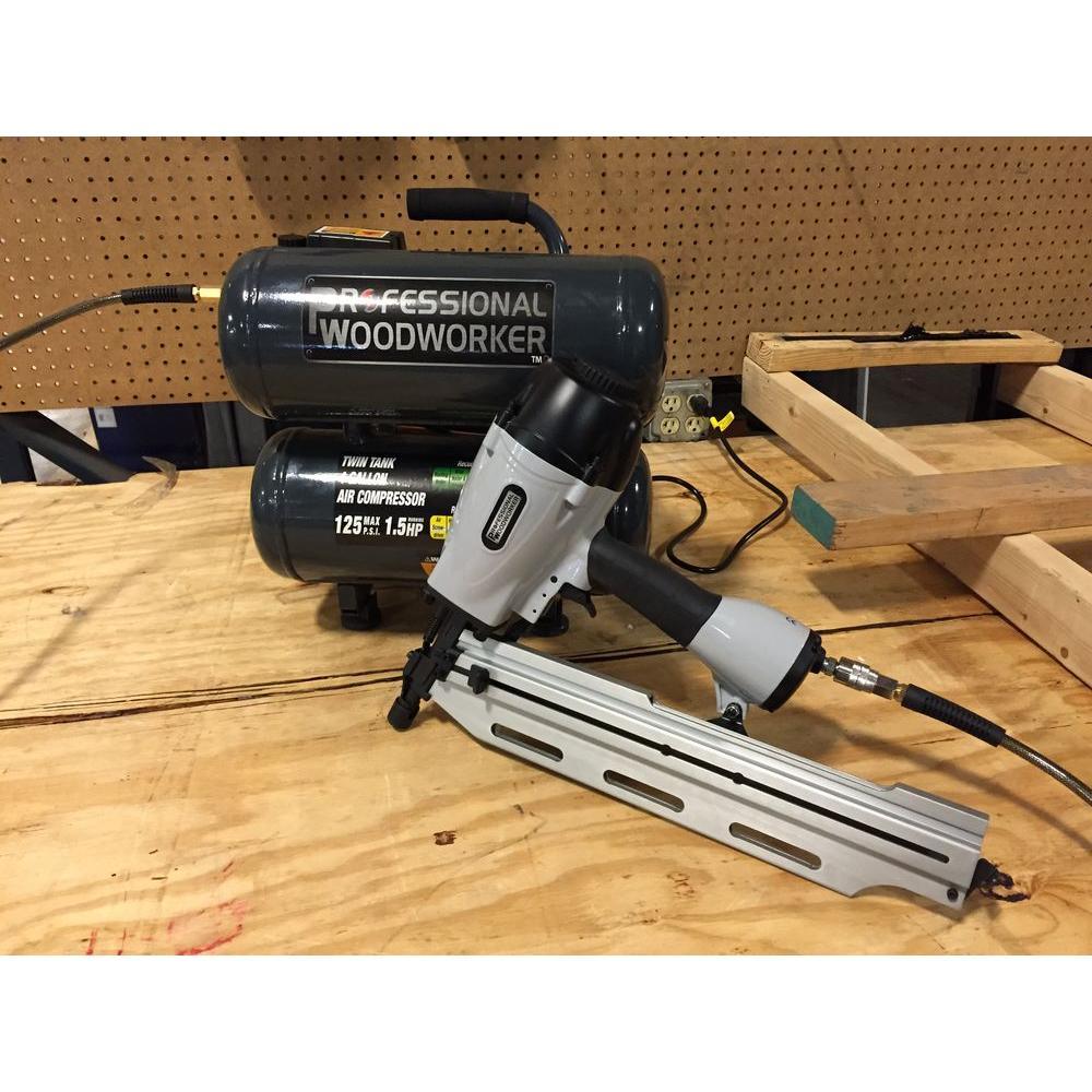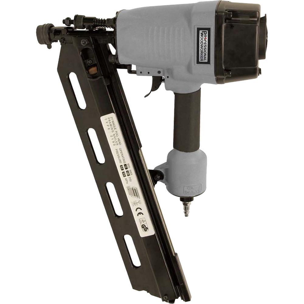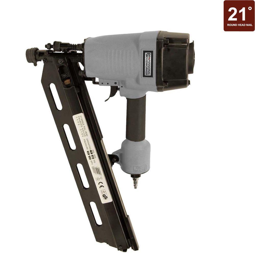 The Professional Woodworker 21° Full Round Head Framing Nailer features an aluminum body and comfortable rubber grip. The Nailer comes equipped with an anti-dry fire mechanism, adjustable drive depth control and an exchangeable sequential and bounce which allows you to drive fasteners faster. With a 75 PSI -120 PSI and a magazine capacity of 55 nails, this Nailer drives in SENCO 1-15/16 in. x 3-1/12 in. (5 0mm -90 mm) size SENCO style nails. The Nailer also comes with gun oil, Allen keys and a male plug.