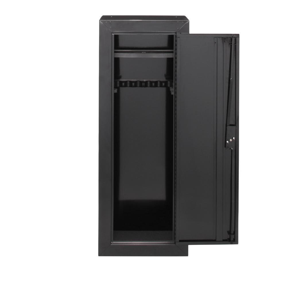 Stack-On's Steel Security Cabinet can hold up to 14 long guns and has been tested and verified to meet the California Department of Justice's standards as a fire arm safety device. Additional storage is available for storing ammo, handguns or other small items by utilizing the removable shelf which is included with the cabinet. This security cabinet has a high gloss black paint finish with chrome accents. This security cabinet offers the security, consumers-preferred features and price that has made Stack-On a value leader in steel security cabinets.
