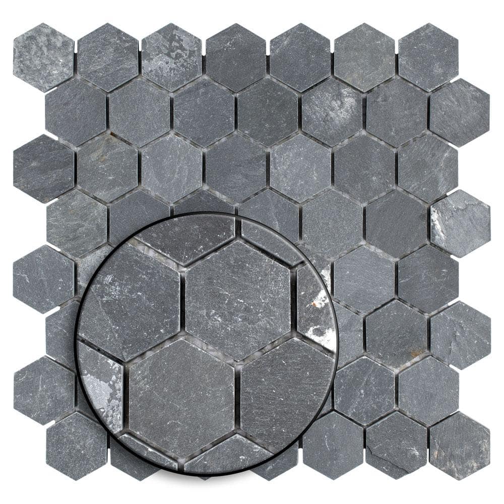 A rugged slate mosaic in a classic hexagon pattern, Crag Hex Black brings deep gray-black natural stone to floors and walls. Impervious and frost resistant, this 8 mm thick mesh-mounted sheet suits indoor and outdoor installations from showers to kitchens.
